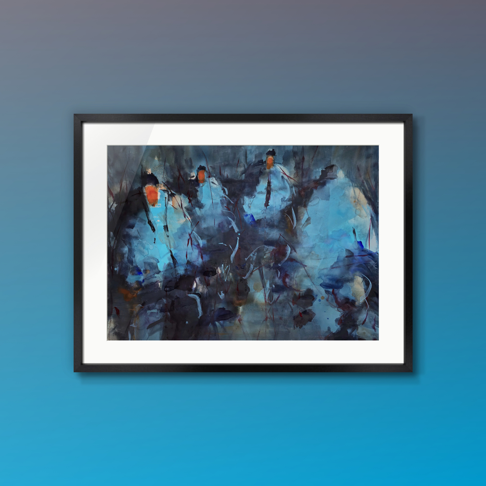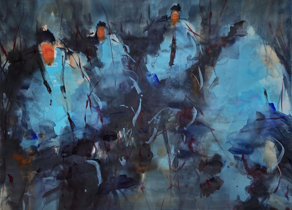 この作品は、都市の中を行き交う人々の存在を、水彩のにじみや重なりによって表現したものです。画面に現れる人影は、はっきりとした輪郭を持たず、色の塊や気配として描かれています。それは、街ですれ違う無数の人々が、記憶の中で曖昧に溶け合っていく感覚を映しています。