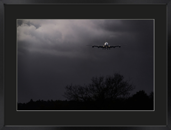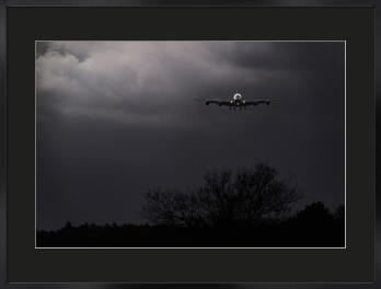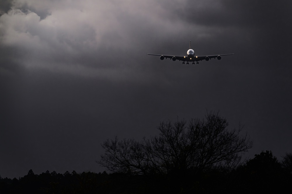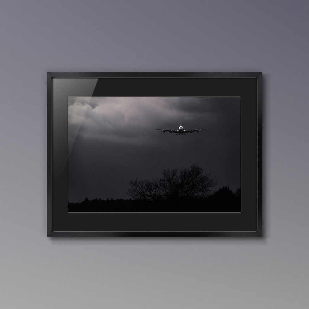 世界最大の旅客機であるA380が、その巨大な翼を広げてこちらへ向かってくる瞬間には、他では味わえない独特の緊張感と高揚感があります。背景の暗雲が描くドラマチックなグラデーションと、機体の金属質感が放つ鈍い光の対比は、見る者に畏怖の念さえ抱かせます。