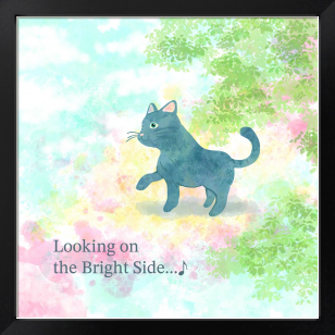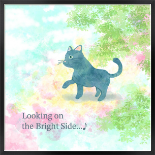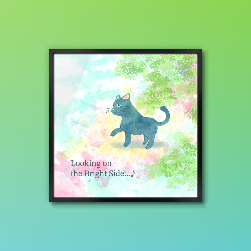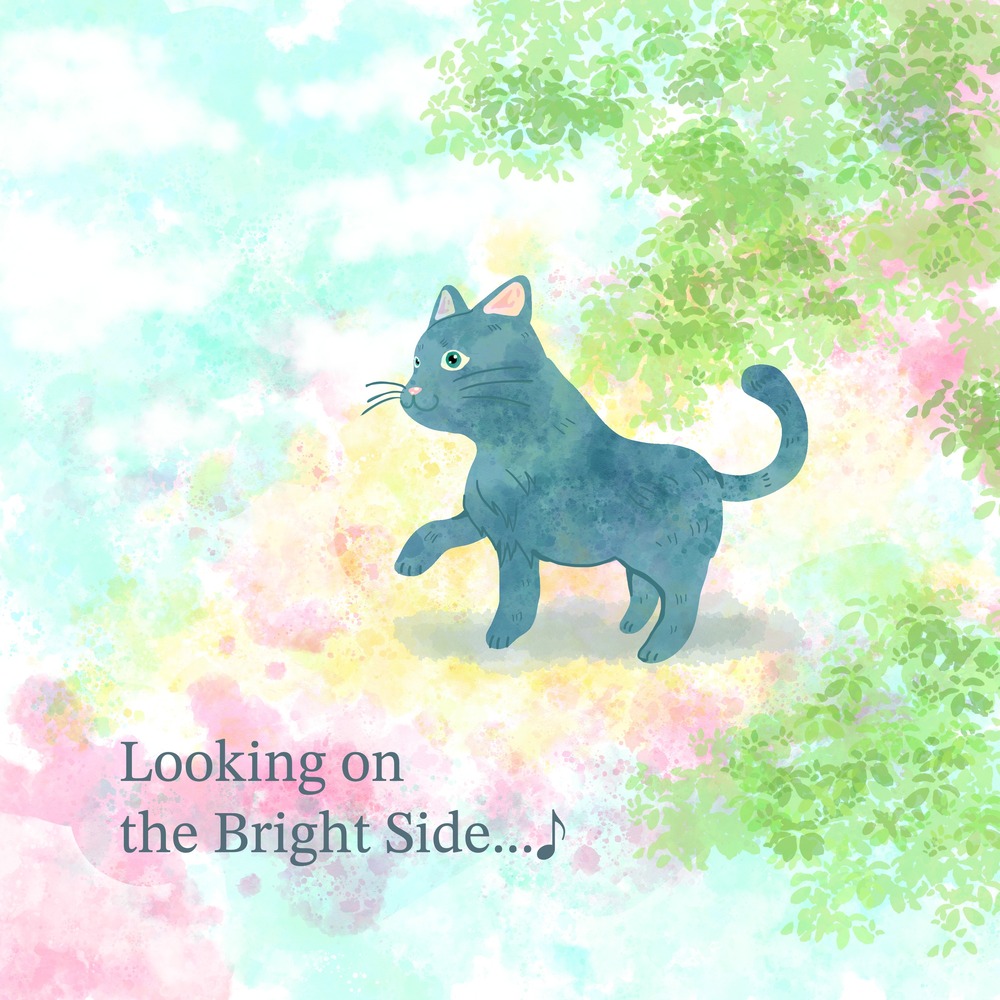 爽やかな緑の中歩く猫。「Looking on the Bright Side」とは直訳すると「明るい側面を見る」という意味です。