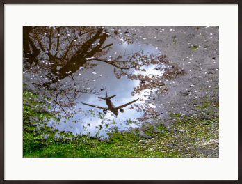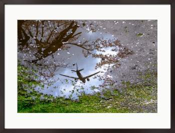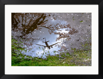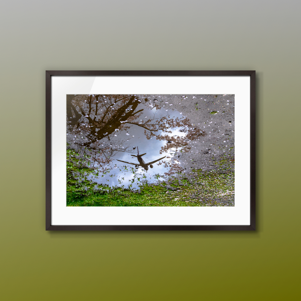 本作の魅力は、実像を直接撮るのではなく、水鏡を通すことで生まれる独特の質感にあります。 淡いピンクの桜と、水面に散りばめられた白い花びら、そして雲間を突き進む機体のシルエット。それらが一つの水面に溶け合う様子は、まるで印象派の絵画のような繊細な美しさを放っています。