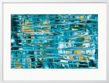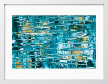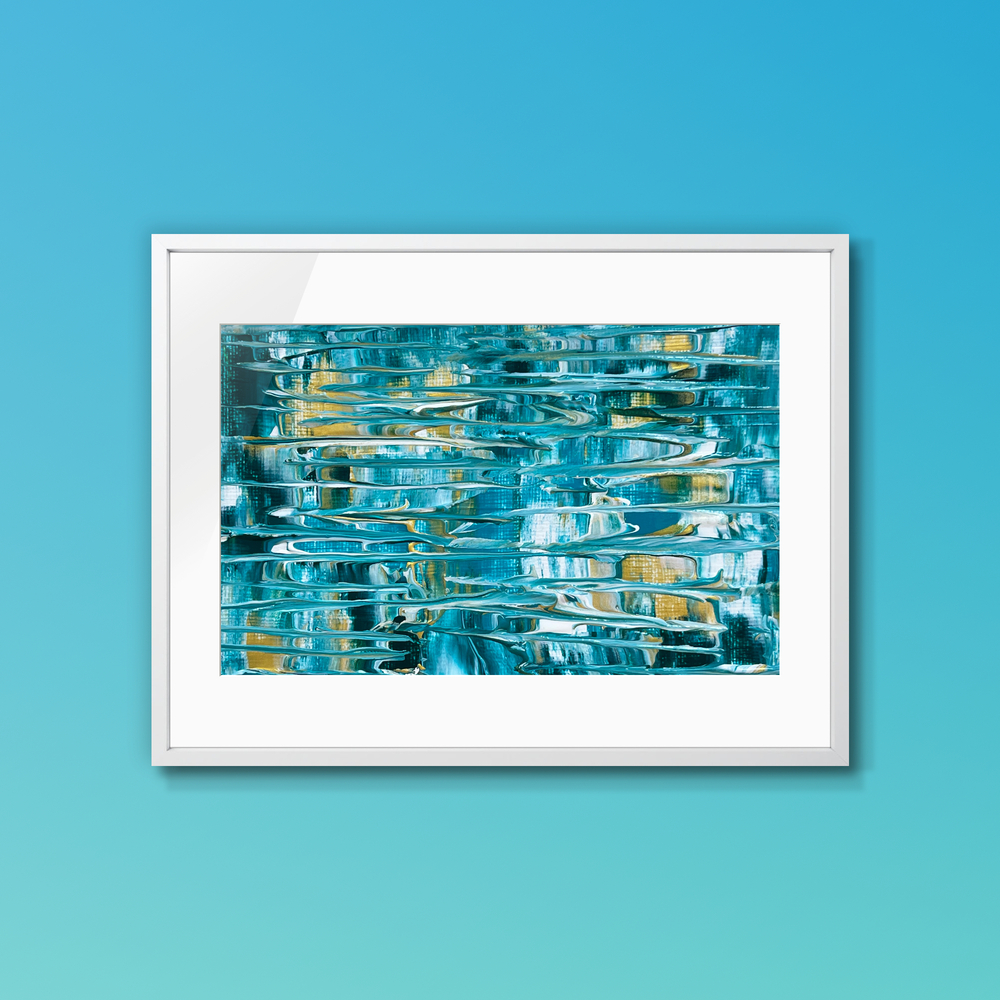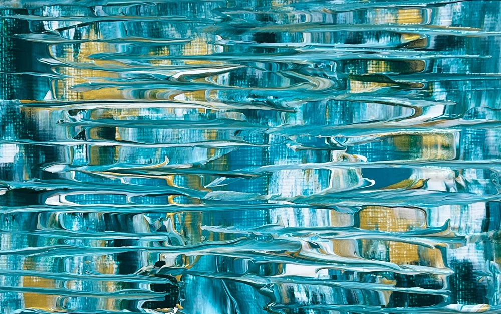 柔らかなターコイズブルーの層に、金色の光が優しく透けるアクリル抽象画です。海の深みから差し込む陽光のように、穏やかで希望に満ちた輝きが広がります。心に静かな癒やしを演出する、詩情あふれる一枚です。