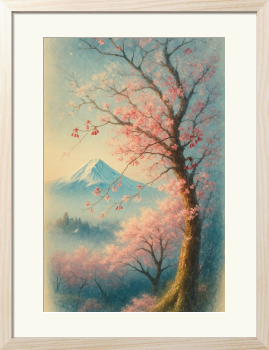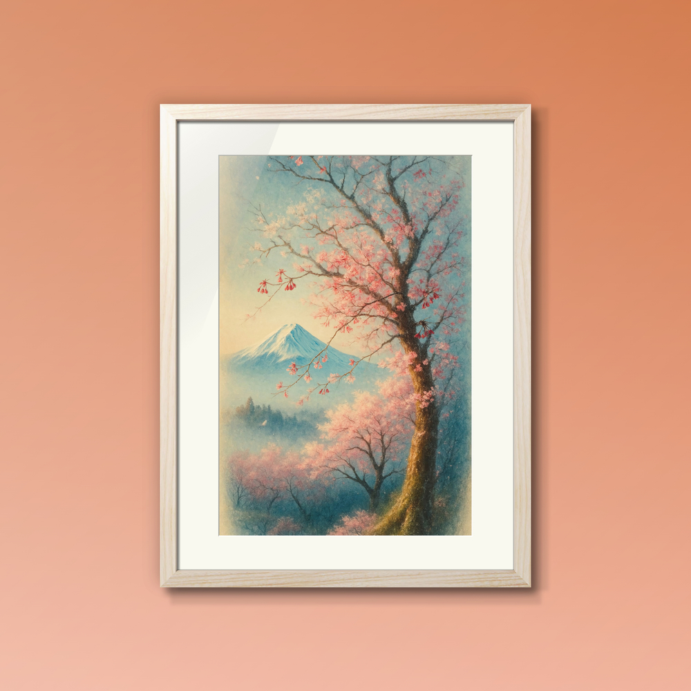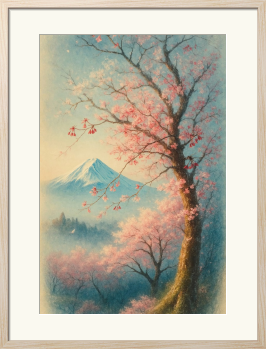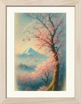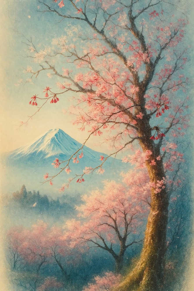桜はひととき咲き、やがて静かに散っていきます。 この作品は、富士山と桜が見せる一瞬の「うつろい」を描いています。 そこにあるのは、ただ刹那に宿る美しさ。 AIツールを用いて制作し、日本的な無常観や、やわらかさ、静けさを大切に仕上げました。