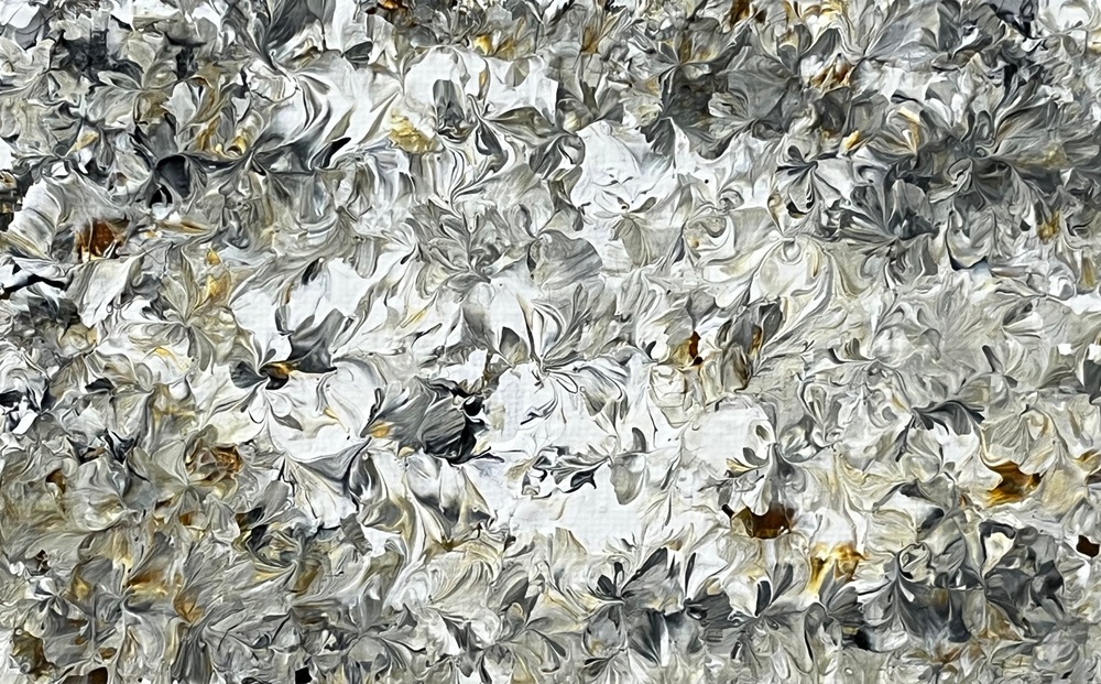 白とシルバーブラックを基調に、ダークブラウンとグレーが繊細に混ざったマーブル模様が、白猫の柔らかな毛並みと月の光を思わせます。厚塗りのテクスチャーが光を反射し、まるで生きているかのように輝きます。清らかで優雅な癒しの空間をお届けします。