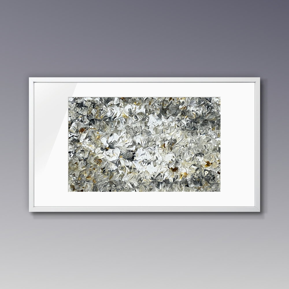 Lunar White Marbling (134) – A luminous abstract acrylic painting that softly immerses you in the ethereal glow of moonlight white marble. Delicate swirls of pure, glowing white flow gracefully across the canvas, accented by subtle silver and misty gray veins that evoke timeless marble polishe