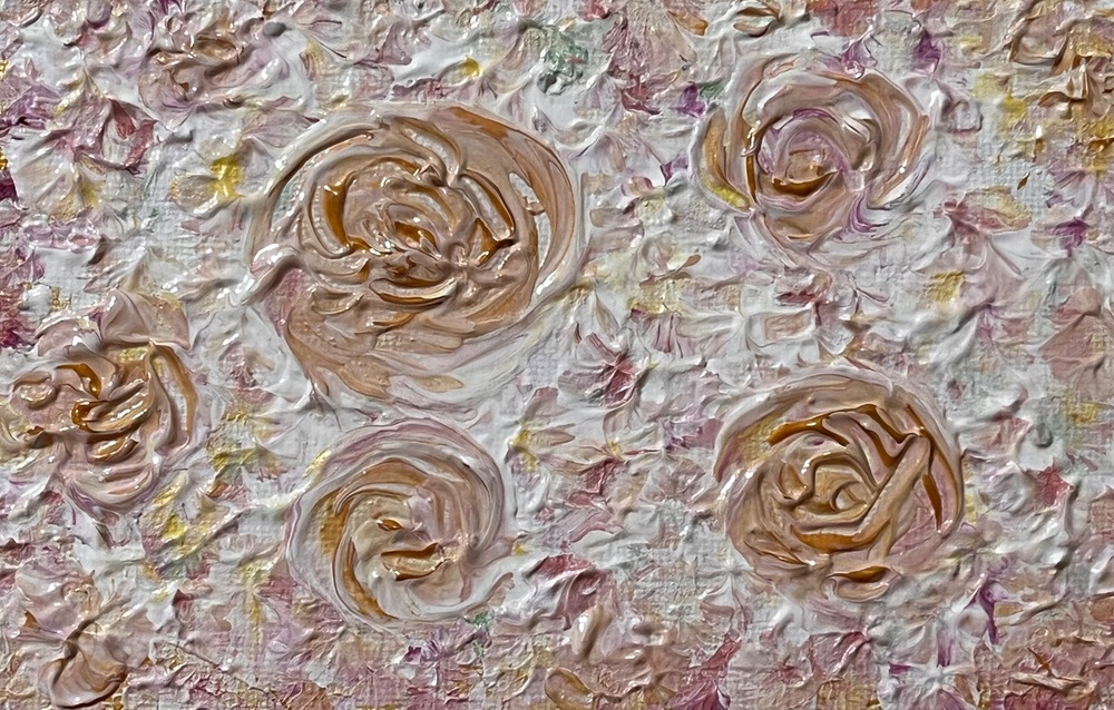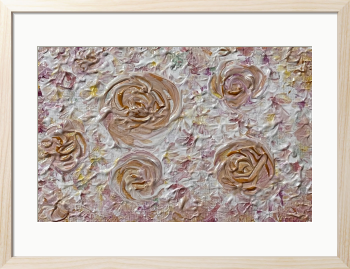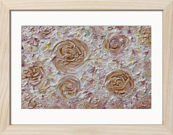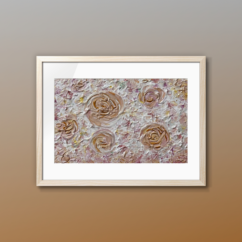 優雅なゴールドを基調にしたバラのデザインが、見る人を魅了する美しさを放っています。このアート作品は、柔らかなピンクのトーンが織り成すハーモニーと、ゴールドの輝きが、空間に洗練された印象を与え、心を豊かにします。