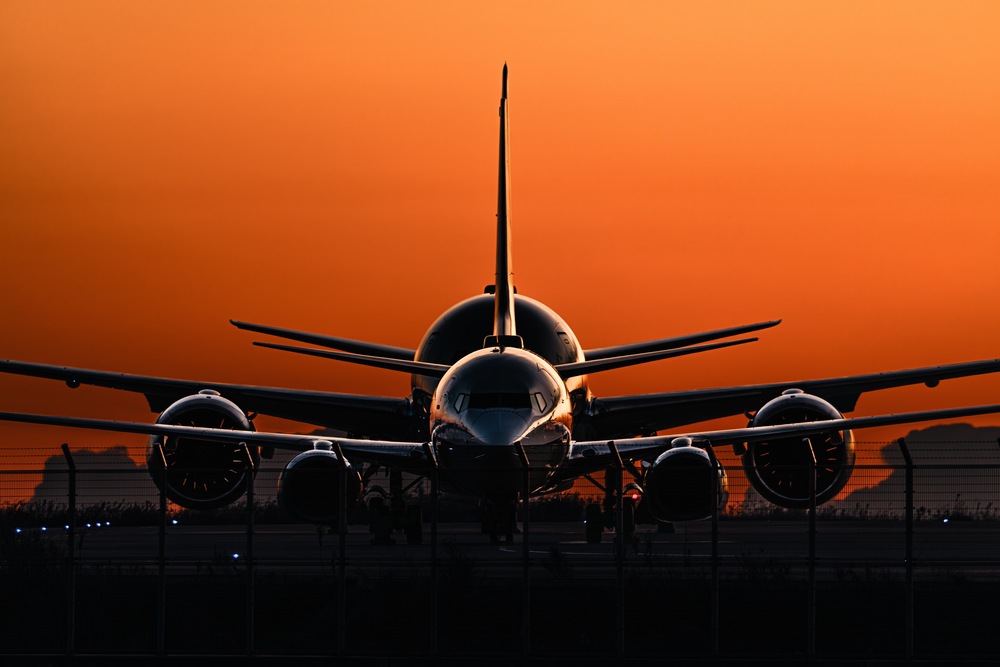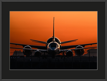 世界が目覚める直前、空が深く燃えるような「朝焼け」に染まる一瞬。 駐機場で出発の時を待つ、ボーイング737と787のシルエットを捉えました。