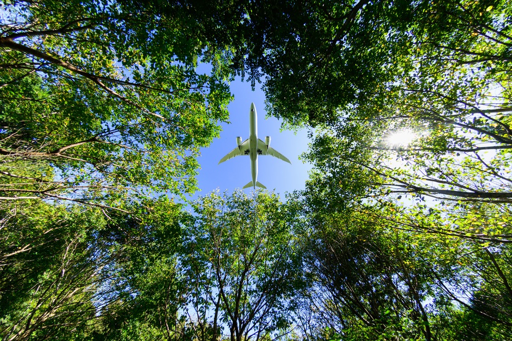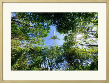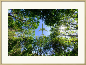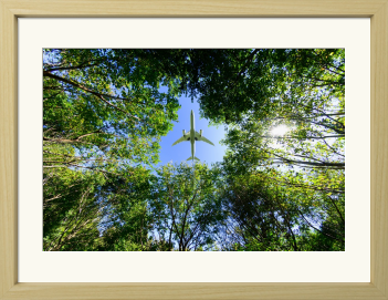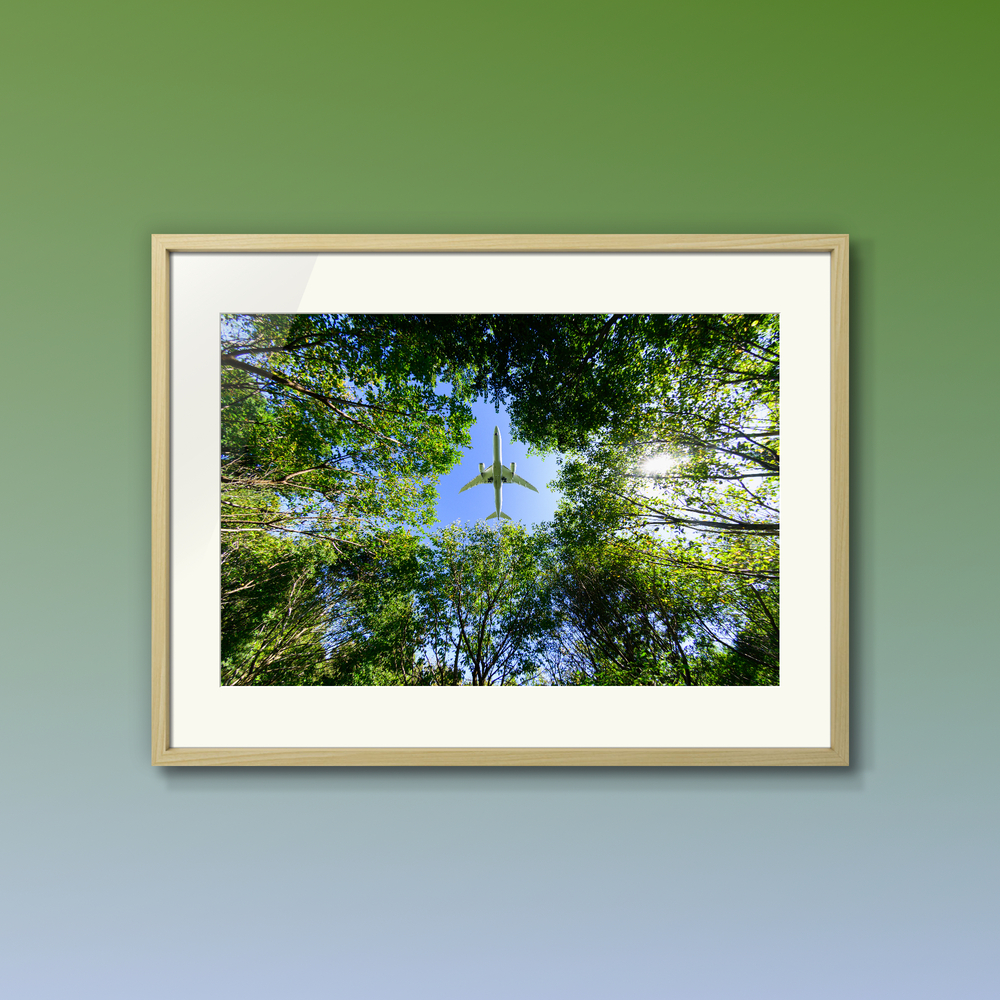 見上げる視界いっぱいに広がる、眩いばかりの新緑。 その生命力あふれる梢の隙間から、一機の飛行機が鮮やかな青空へと吸い込まれていく瞬間を捉えました。