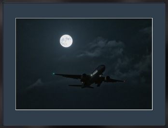 漆黒の空を背景に、月光を浴びて浮かび上がる重厚なシルエット。翼の先端で光るナビゲーションライトが、暗闇の中に確かな存在感を刻んでいます。着陸を目前に控えた機体の凛とした佇まいは、薄い雲を透かして届く月の柔らかな輝きに包まれ、まるで夢の中の光景のような気品を漂わせています。