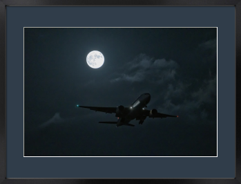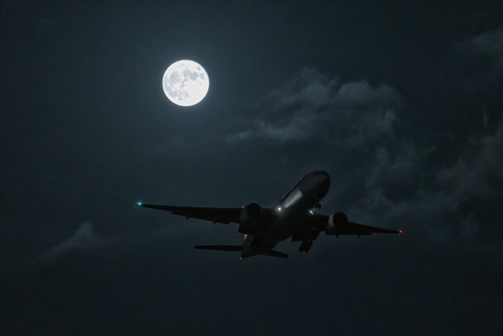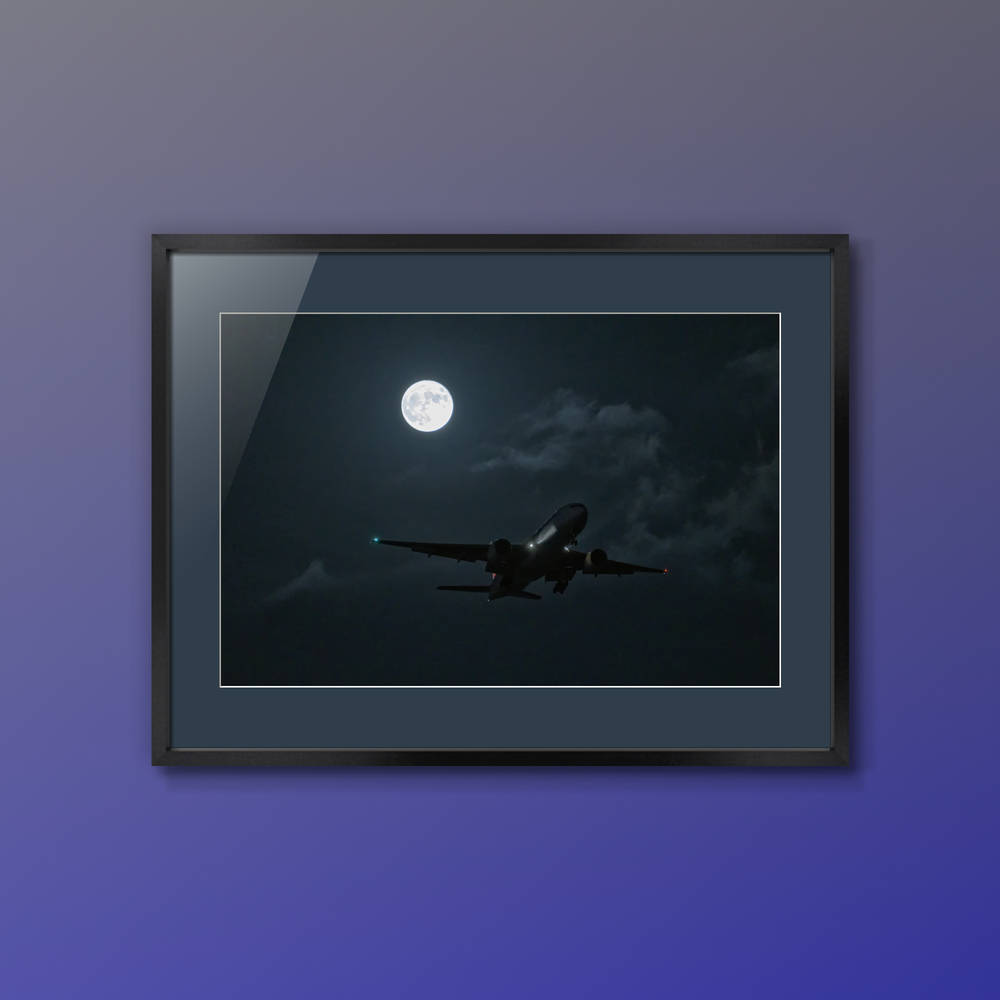深い闇に包まれた夜の帳。煌々と輝く満月の傍らを、一機の機体が静かに滑走路へと高度を下げていく。 長い旅路を終え、月明かりに導かれるように帰還するドラマチックな着陸の瞬間を捉えました。