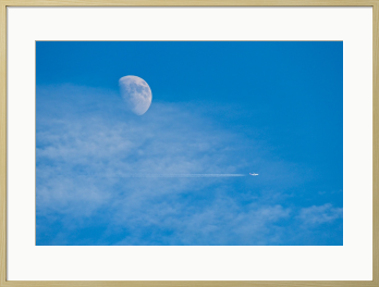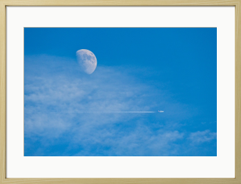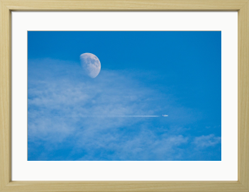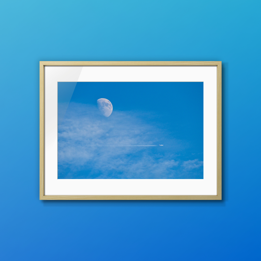 本作の魅力は、柔らかな雲が広がる空の質感と、飛行機雲が描く鋭い「直線」の対比にあります。 天体としての悠久の時間を感じさせる月と、現代の旅路を象徴する一筋の雲。それらが交差する光景は、どこまでも高く、自由な空への憧れを呼び起こします。