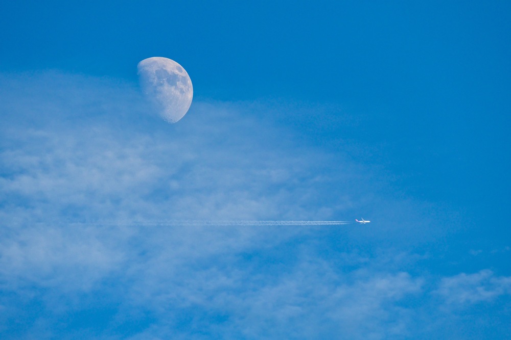澄み渡る日中の青空に、うっすらと、しかし確かにその存在を示す昼の月。 その穏やかな佇まいを横切るように、一機の航空機が真っ白な飛行機雲のラインを刻んでいく。 広大な空のキャンバスに描かれた、ミニマリズムを感じさせる一瞬の芸術です。