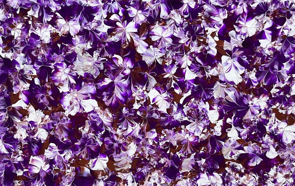 Amethyst Murmur Veil (144) – A delicate abstract acrylic painting that touches you with the murmuring veil of amethyst. Soft whispering layers of deep amethyst and misty lavender create a tender veil with silver accents. This healing masterpiece awakens graceful stillness and inner resonance.