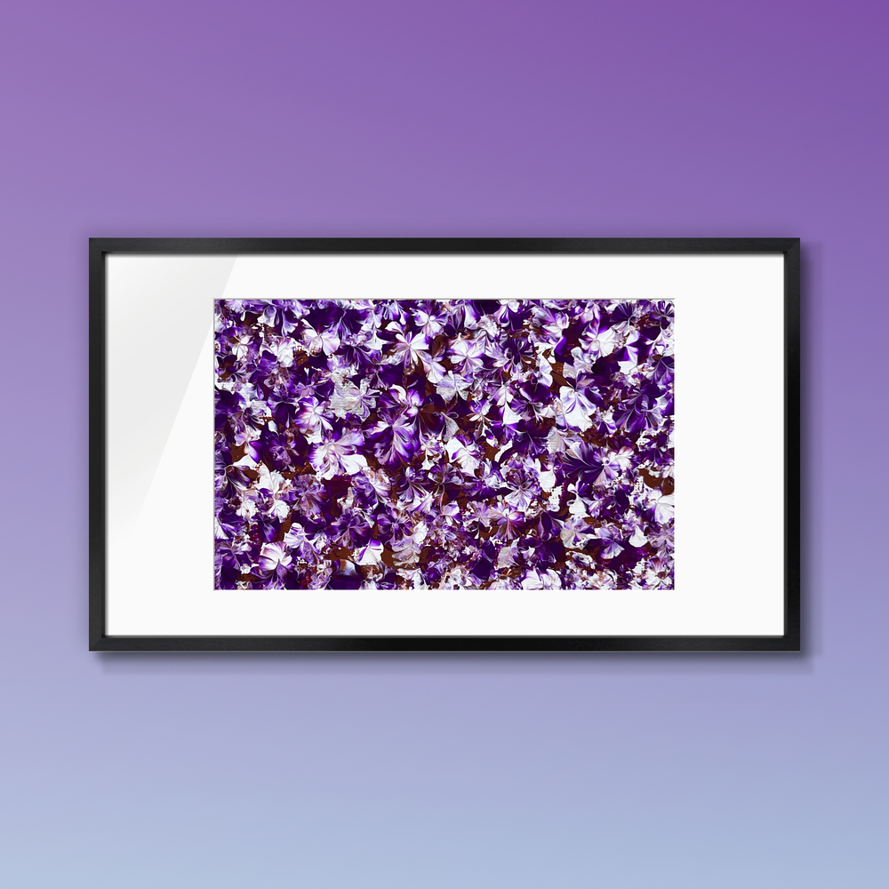深い紫の波が優雅に絡み合い、銀の光が静かにざわめく作品です。心の内側で響く微かなささやきのように、穏やかで神秘的な感情を呼び起こします。現実の向こう側に広がる、優しい幻想の世界へ誘う一枚です。