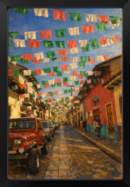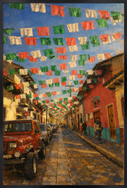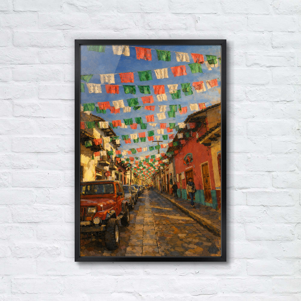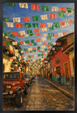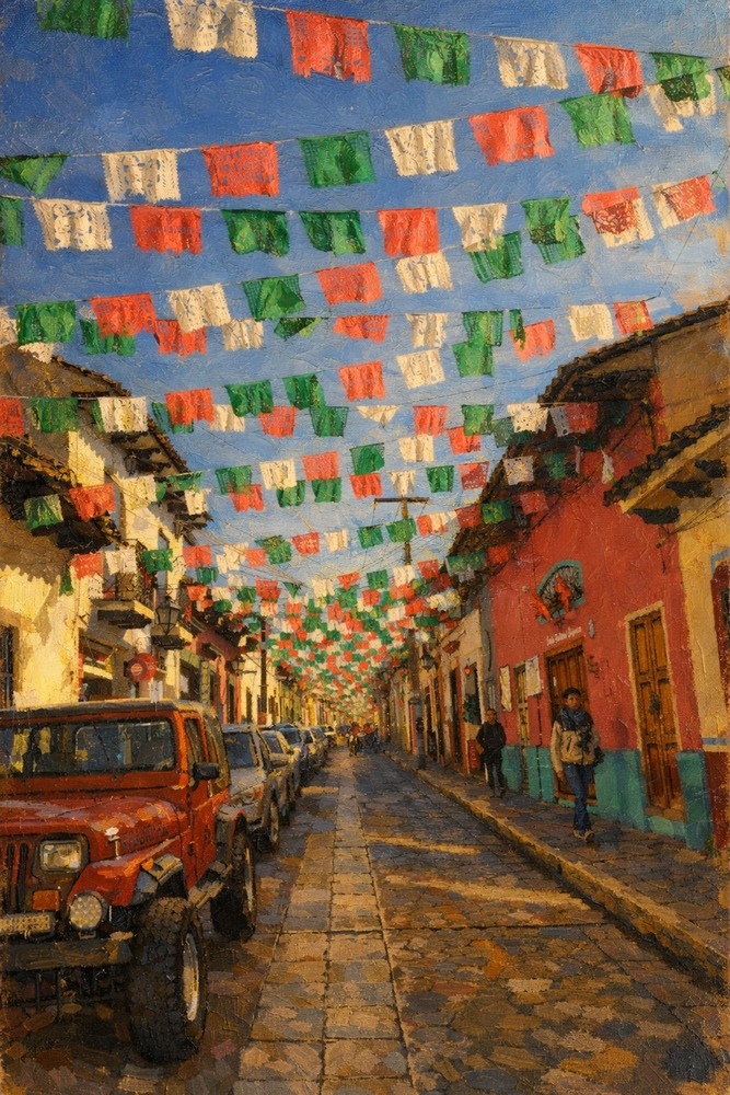 チアパス州サンクリストバル・デ・ラス・カサスのストリート風景をモチーフにした 油絵風アート作品です。 旅先で撮影した写真をもとに制作しています。