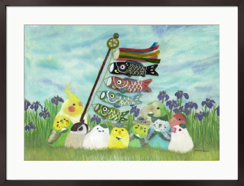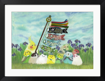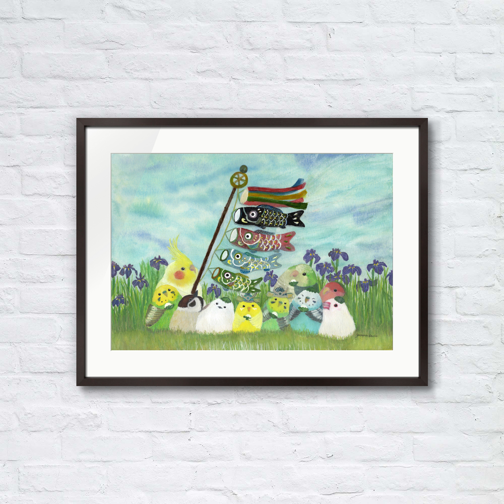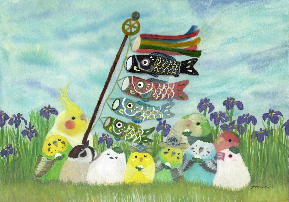 青空の下で こどもの日、柏餅を食べていたり、頭にのっけて柏餅みたいな小鳥たち。 菖蒲とこいのぼり、兜を描きました。 端午の節句にもおすすめな絵画です。 オカメインコ セキセイインコ スズメ シマエナガ オキナインコ コザクラインコ 文鳥 もしも…鳥たちの世界があったなら……。 自由に物語を想像していただけましたら幸いです。 お部屋に飾るインテリアアートとしてもおすすめの1枚です。