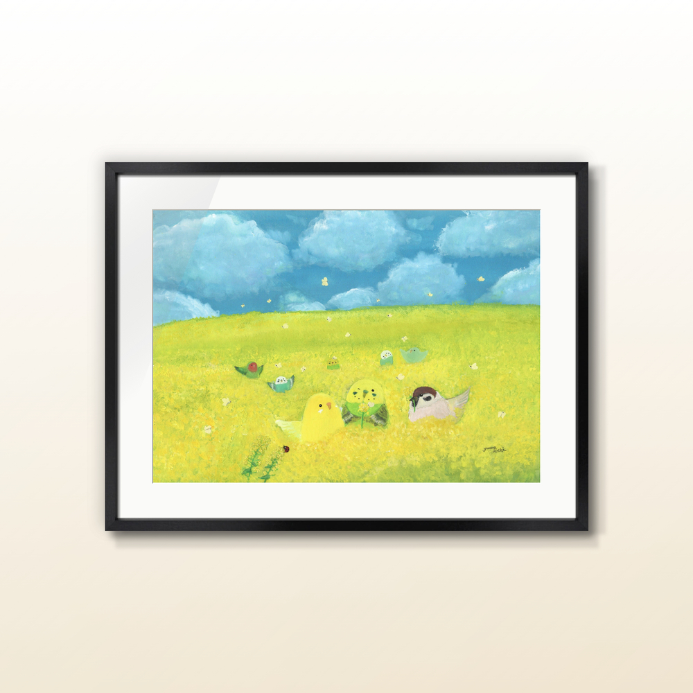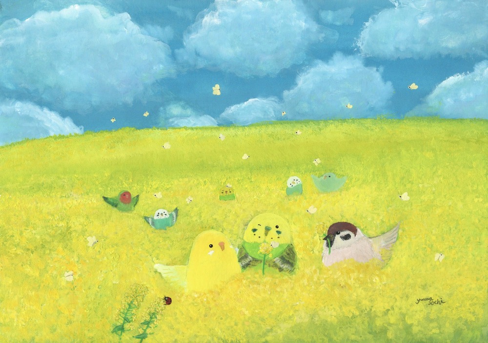花畑と小鳥たちを描いたイエローが綺麗なインテリアアートとしてもおすすめの絵画です。 小鳥達を優しいタッチで描きました。 もしも…鳥たちの世界があったなら……。 自由に物語を想像していただけましたら幸いです。 お部屋に飾るインテリアアートとしてもおすすめの1枚です。
