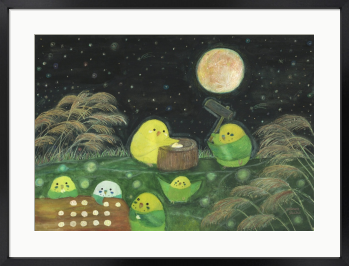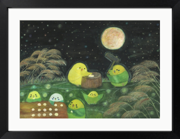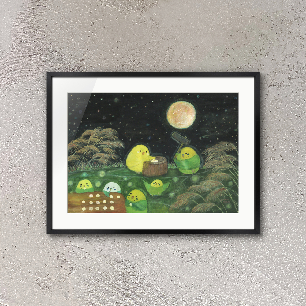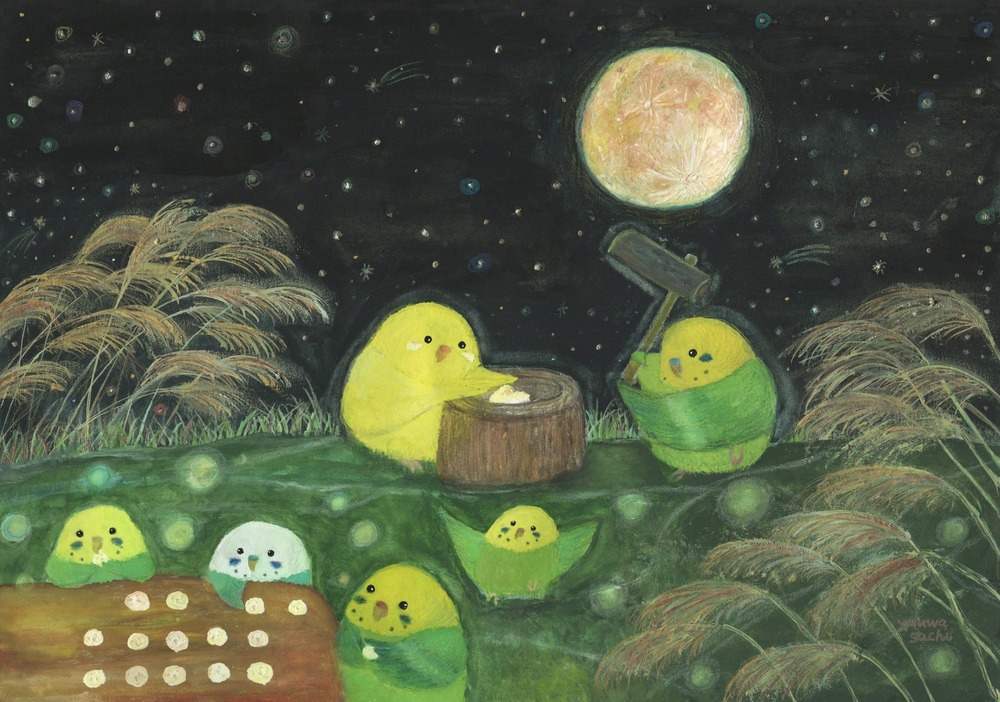 【お月見餅つきインコたち】 月とお月見を楽しむ小鳥たちを描いた絵画です。 もしも…鳥たちの世界があったなら……。 自由に物語を想像していただけましたら幸いです。 お部屋に飾るインテリアアートとしてもおすすめの1枚です。