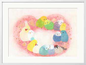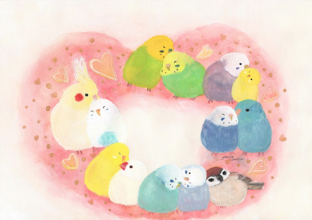 羽繕いインコたち 小鳥たちは仲良く羽繕いしています。 丸い小鳥たちの輪の形、リースの形は永遠の象徴とされており、 幸せがずっと続きますようにという願いが込められている心和む絵画です。 もしも…鳥たちの世界があったなら……。 自由に物語を想像していただけましたら幸いです。 お部屋に飾るインテリアアートとしてもおすすめの1枚です。