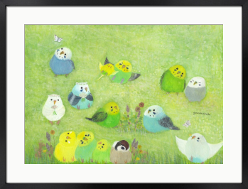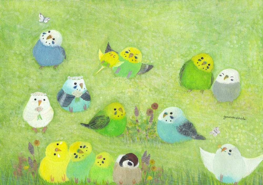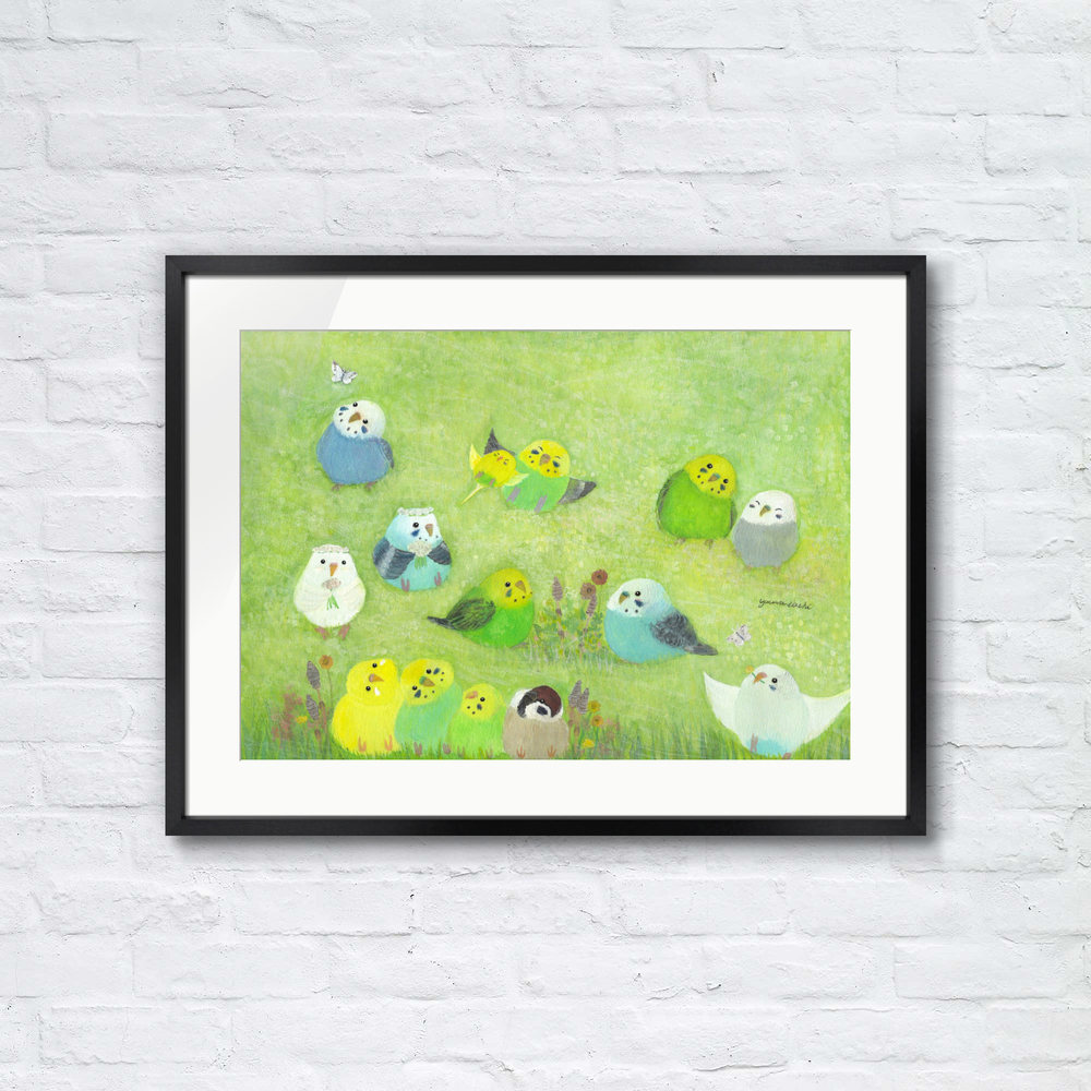 野原でのんびり _________ 風が心地よい中でのんびりしているインコたち。 自然と触れあうと癒される。 優しい気持ちになれる心和む絵画です。 もしも…鳥たちの世界があったなら……。 自由に物語を想像していただけましたら幸いです。 お部屋に飾るインテリアアートとしてもおすすめの1枚です。