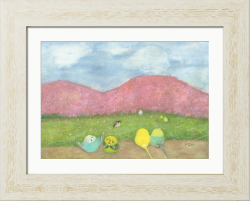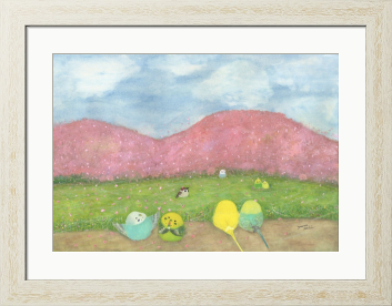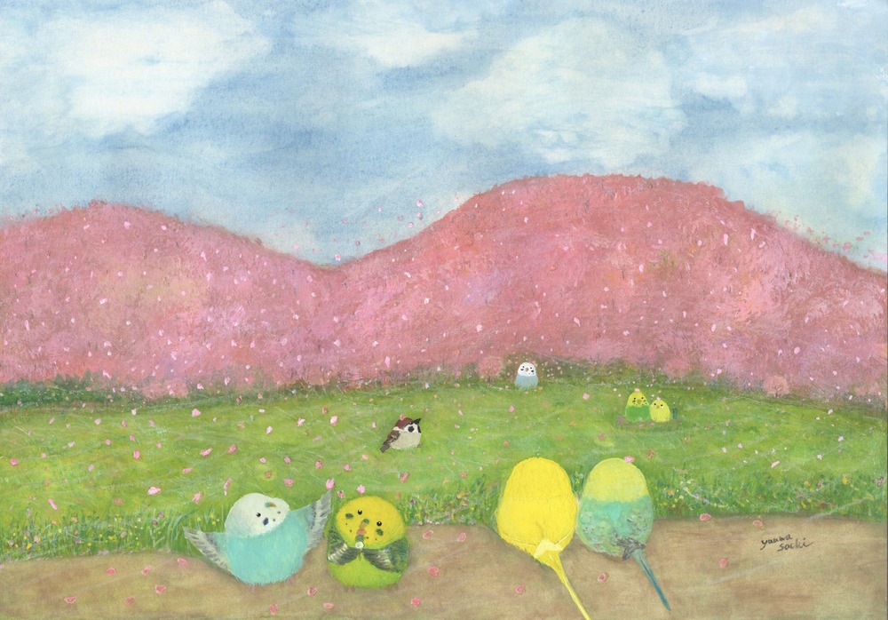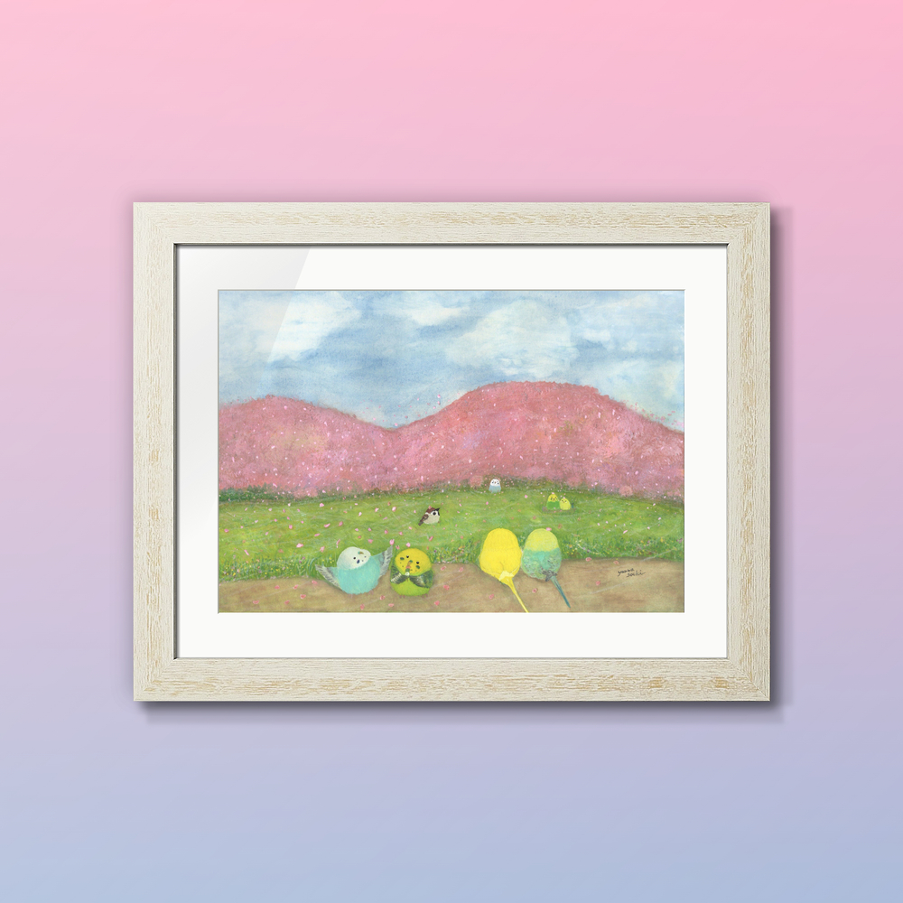 【桜吹雪インコたち】 桜と風に舞う桜吹雪、セキセイインコたち、スズメを描いた絵画です。 桜を楽しむ小鳥達を優しいタッチで描きました。 もしも…鳥たちの世界があったなら……。 自由に物語を想像していただけましたら幸いです。 お部屋に飾るインテリアアートとしてもおすすめの1枚です。