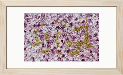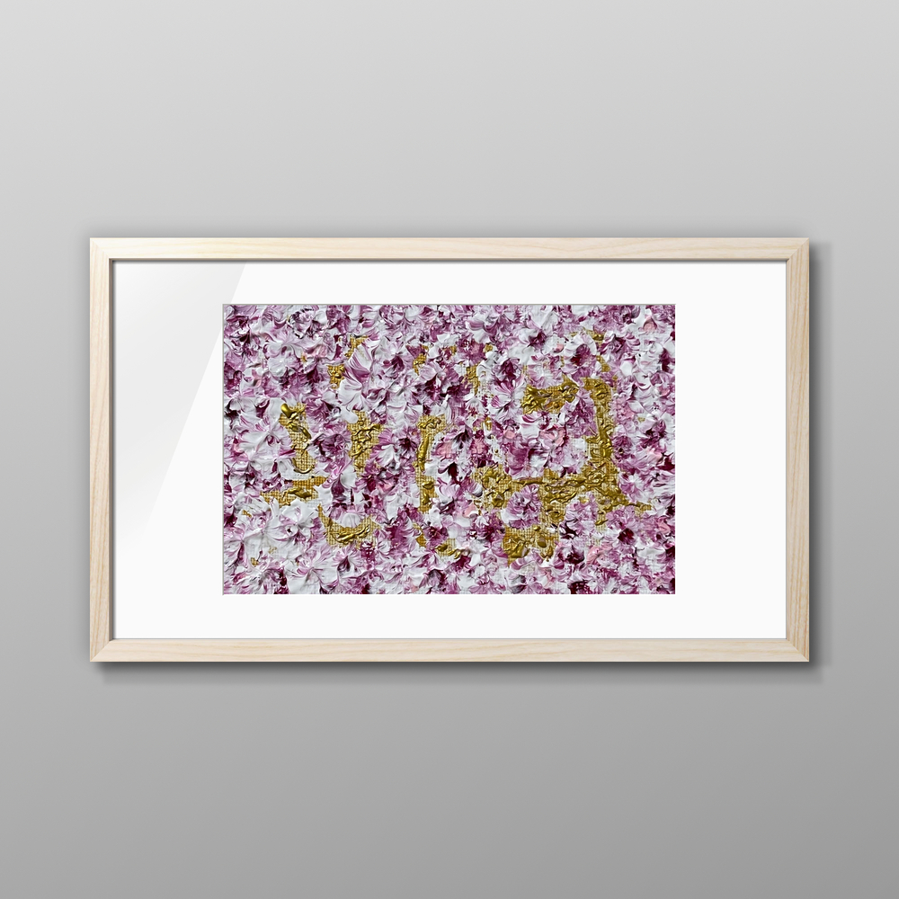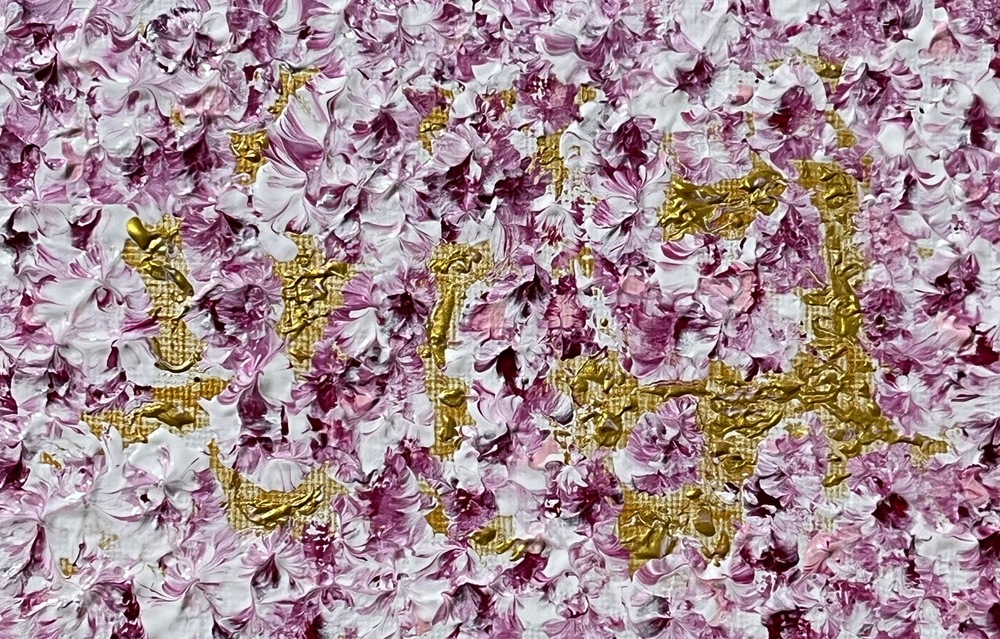 深い紫と白を纏った繊細で美しい花びらが、輝く金の舞台に舞い、静かに空間に響き合う作品です。心の奥底に残る微かな記憶や、言葉にできない想いを、優しく受け止めてくれます。過ぎ去った時間に寄り添いながら、新たな静けさを生み出すような、幻想的な余韻を残します。
