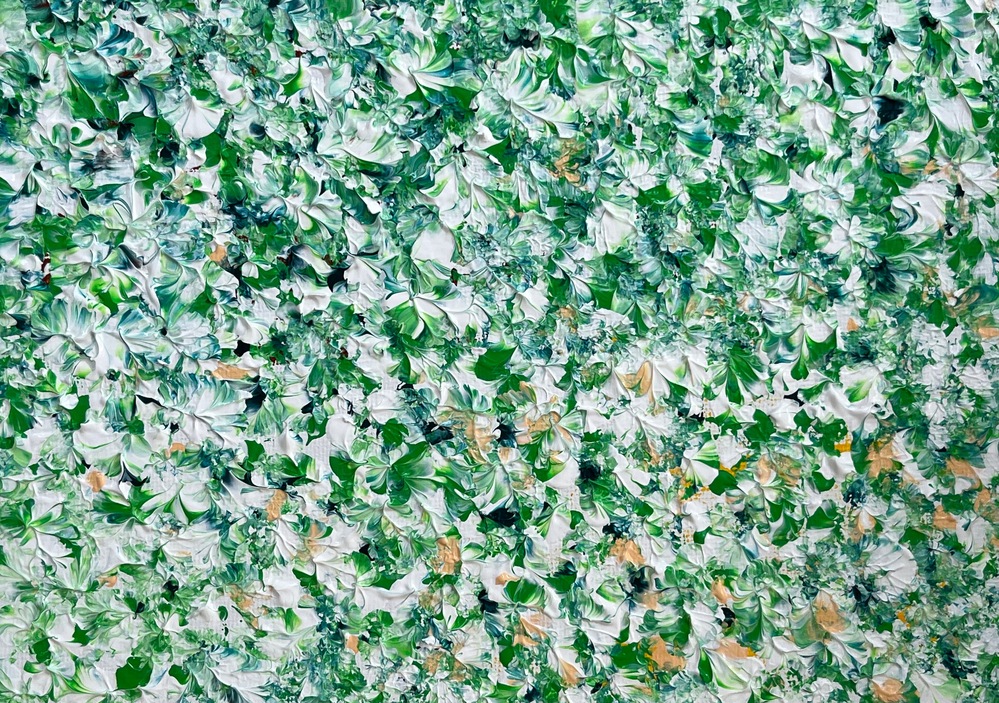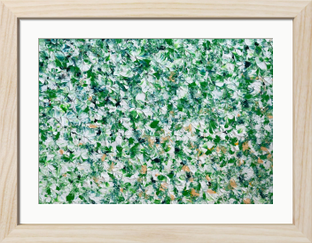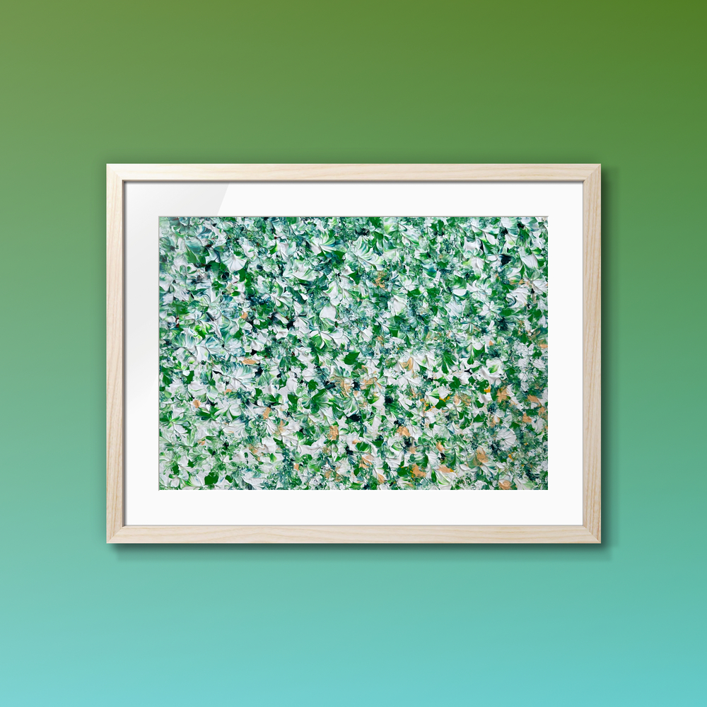 鮮やかな緑のしろつめ草が柔らかな風にそよぐ様子を描いた作品です。穏やかな空間が心に広がり、日常のストレスを和らげるような安らぎをもたらしてくれます。まるで静かな庭で優しい風を感じながら、心を解きほぐすような感覚をお楽しみいただけます。