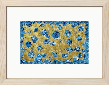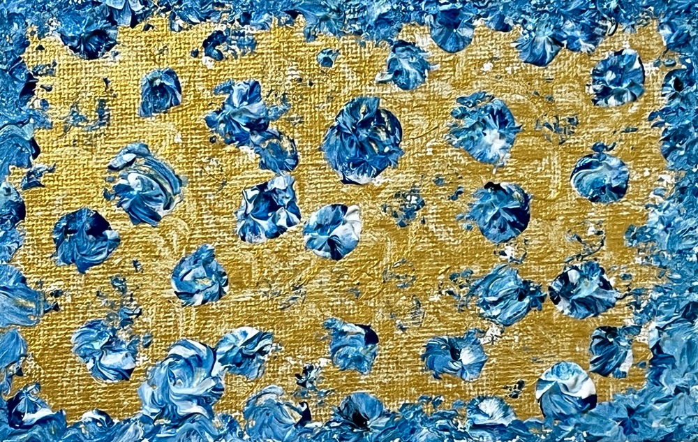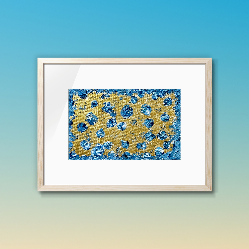 ゴールドの空間に浮かぶ深い青のモザイクが静かに意識に溶け込む作品です。繊細な青の色彩が、まるで宇宙の神秘を感じさせるかのように広がり、心の中に安らぎと希望をもたらします。静かに流れる時間の中で、自身の内側に目を向けるひとときを感じながら、夢の中にいるような感覚をお楽しみください。