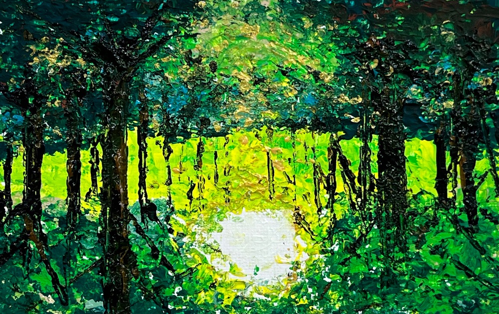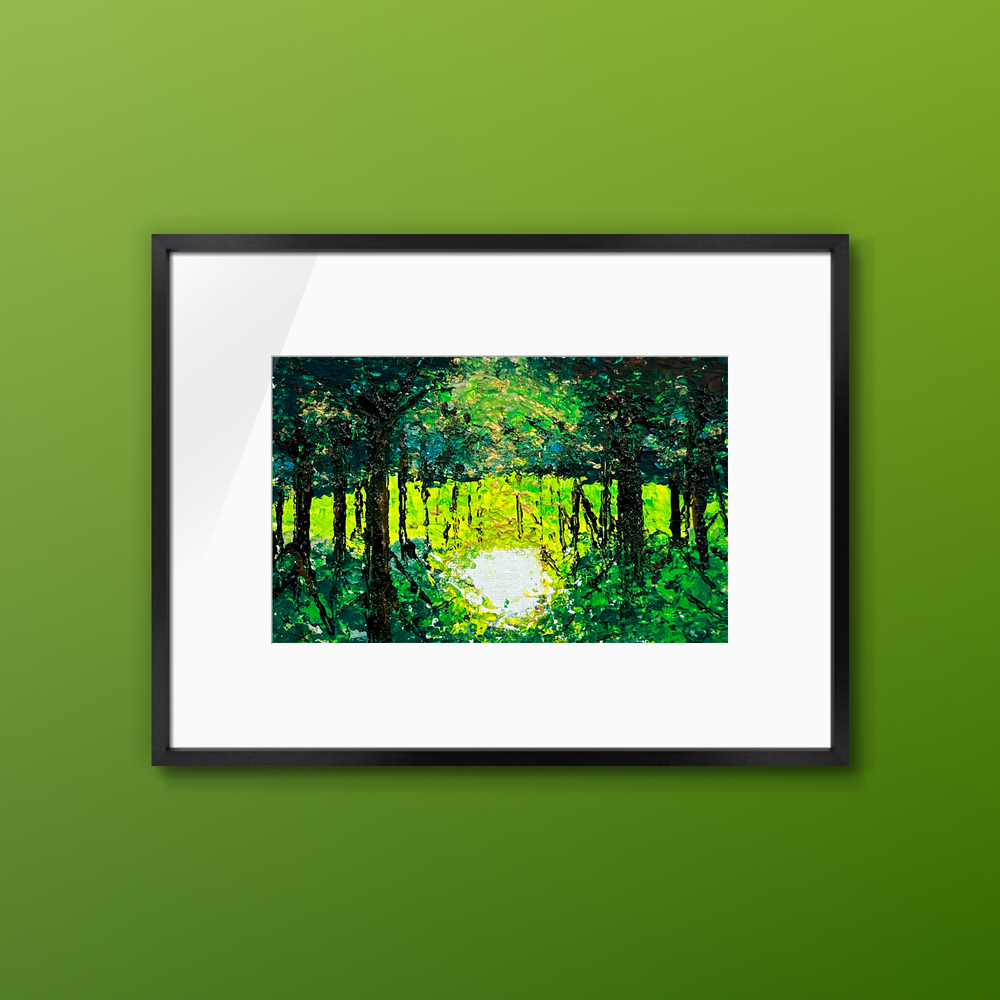 深い緑の葉叢が重なり合う森の奥で、光の柔らかな輪郭が浮かび上がります。鮮やかな緑は、まるで森の深い静寂を映し出し、心の奥深くに安らぎと活力を与えます。この作品は、穏やかな時間が流れる中で、自身の内面と向き合うひとときを体験し、永遠の緑に包まれるような安堵をそっと与えてくれます。