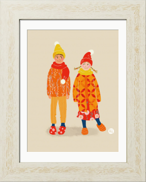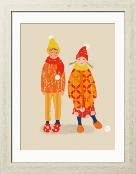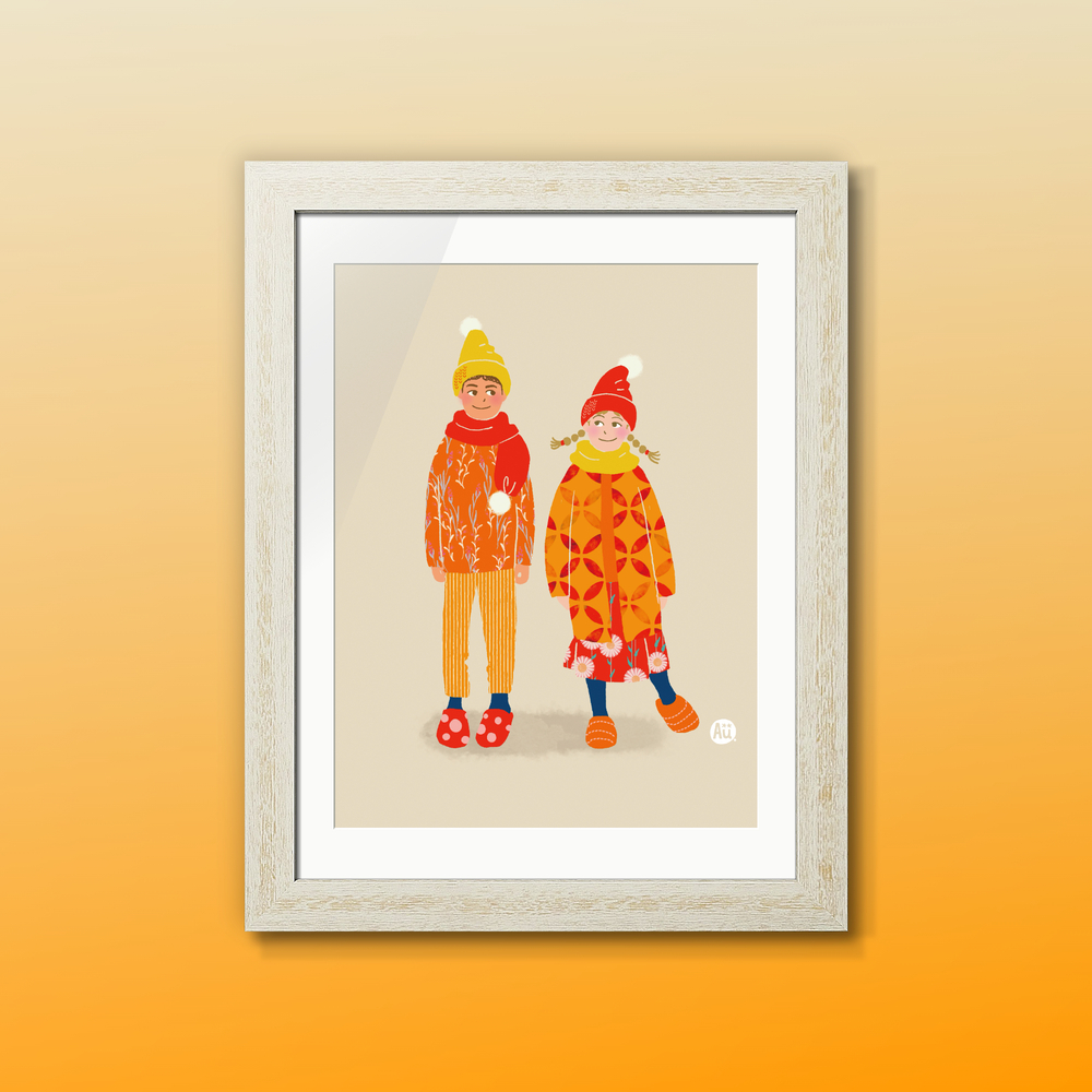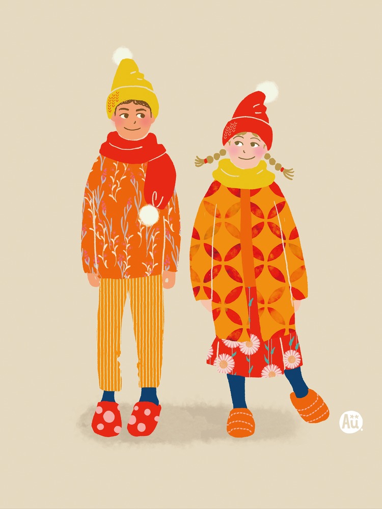 あたたかな色のコートとマフラーに包まれた、子どもたちの冬のひとときです。 オレンジや赤を基調にした配色で、心がほっとする雰囲気に仕上げました。