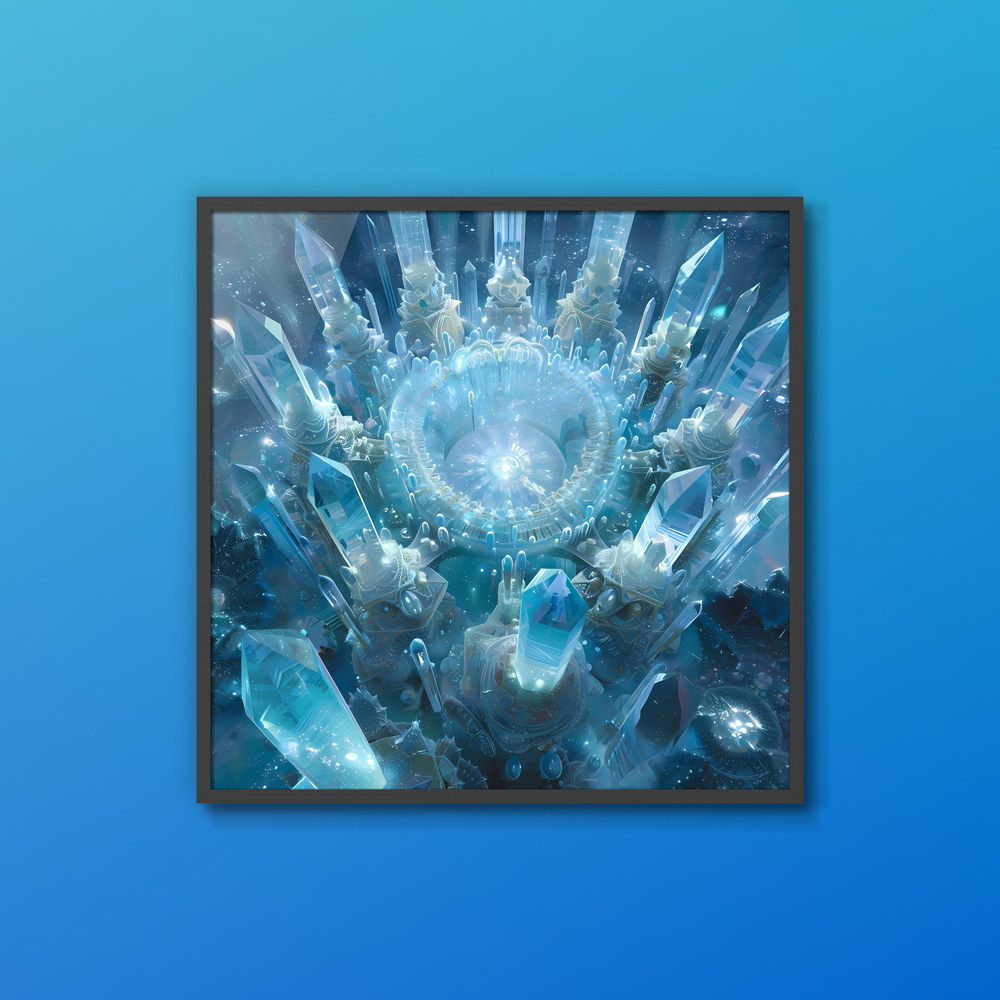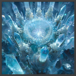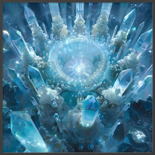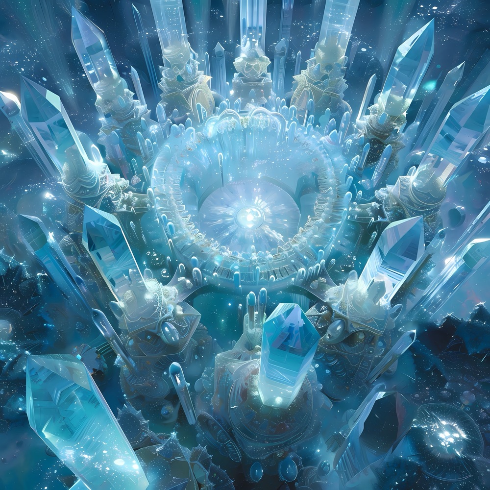 この聖域は、 世界が形を持つ以前から存在している。 結晶の柱が円環を描き、 中心には、名づけられる前の光が宿る。 ここは、 創造が始まる場所であり、 同時に、すべてが還っていく場所。 意志も、記憶も、役割も、 この輪の中では静かにほどけ、 本来の振動だけが残される。 この作品は、 外側の世界へ向かうためのものではない。 見る者が、 自分自身の深層へ戻るための 内なる起源の座標として存在している。