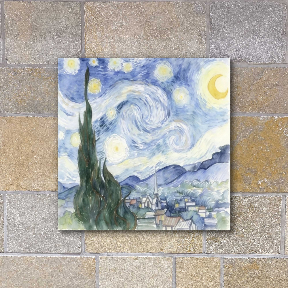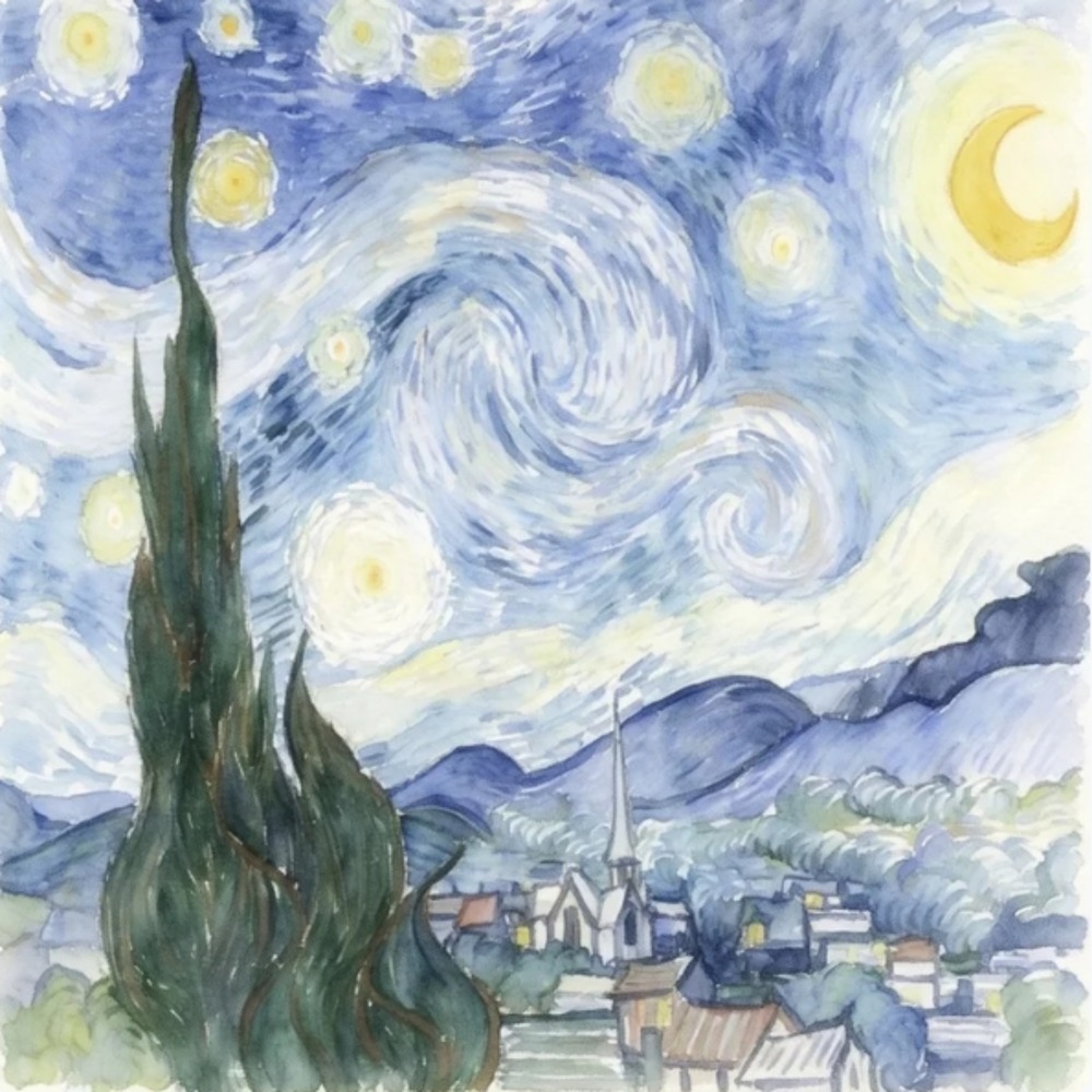 ヴィンセント・ヴァン・ゴッホの名作『星月夜』を繊細な水彩画のタッチで再解釈したこの作品は、原画が持つ情熱的なエネルギーと、水彩特有の透明感あふれる穏やかさが共存する独特の世界観を提示しています。画面左側に堂々とそびえ立つ糸杉は、天に向かってうねるような生命力を感じさせつつも、柔らかな筆致によって周囲の風景へと自然に溶け込み、夜空を彩る巨大な渦巻きや光り輝く星々は、淡いブルーとイエローのグラデーションによって幻想的かつ静謐な光を放っています。遠景に広がる山並みやふもとの街並みは、水を含んだ絵具の滲みがもたらす優しい質感によって描き出され、教会の尖塔が象徴する静かな祈りの時間が、冷たい夜の空気の中に温もりを添えています。力強い厚塗りの油彩で表現された原曲の「動」のイメージに対し、本作は色が重なり合い響き合うことで生まれる「静」の叙情性を強調しており、見る者を夜の静寂の中に誘うような深い癒やしを与えます。伝統的なモチーフを現代的で軽やかな視点から捉え直したこの一枚は、古典への敬意を保ちながらも、水彩画ならではの優美な情緒を纏った新しい芸術的表現として成立しています。