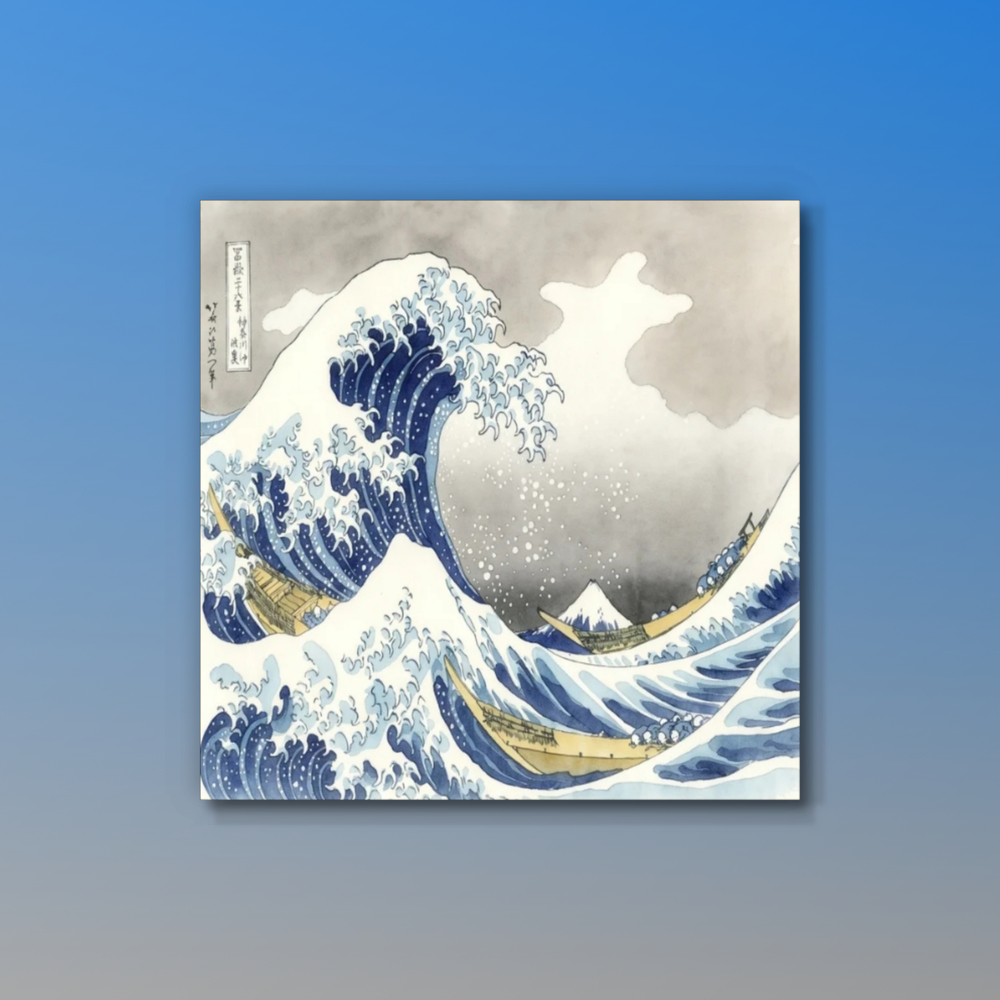 葛飾北斎の名作『富嶽三十六景』の中でも最も名高い「神奈川沖浪裏」をモチーフに、伝統的な浮世絵の木版画スタイルをあえて瑞々しく柔らかな水彩画の技法で再解釈したこの作品は、天に向かって荒々しく逆巻く巨大な大波の動的な力強さと、その背後に毅然と、かつ静謐に佇む富士山の不動の美しさが対照的に描かれており、本来の力強い輪郭線や鮮やかなベロ藍の色彩が水彩特有の繊細なぼかしや淡いグラデーションに置き換わることで、自然の猛威の中にもどこか幻想的で穏やかな叙情性が漂う独特の世界観を構築しているだけでなく、翻弄される小舟に乗る人々が放つ極限の緊張感と、空を覆う灰白色の雲から透ける光の粒子のような表現が絶妙に融合し、時を超えて愛される古典的な構図に現代的な軽やかさと新たな生命を吹き込むことに成功しています。
