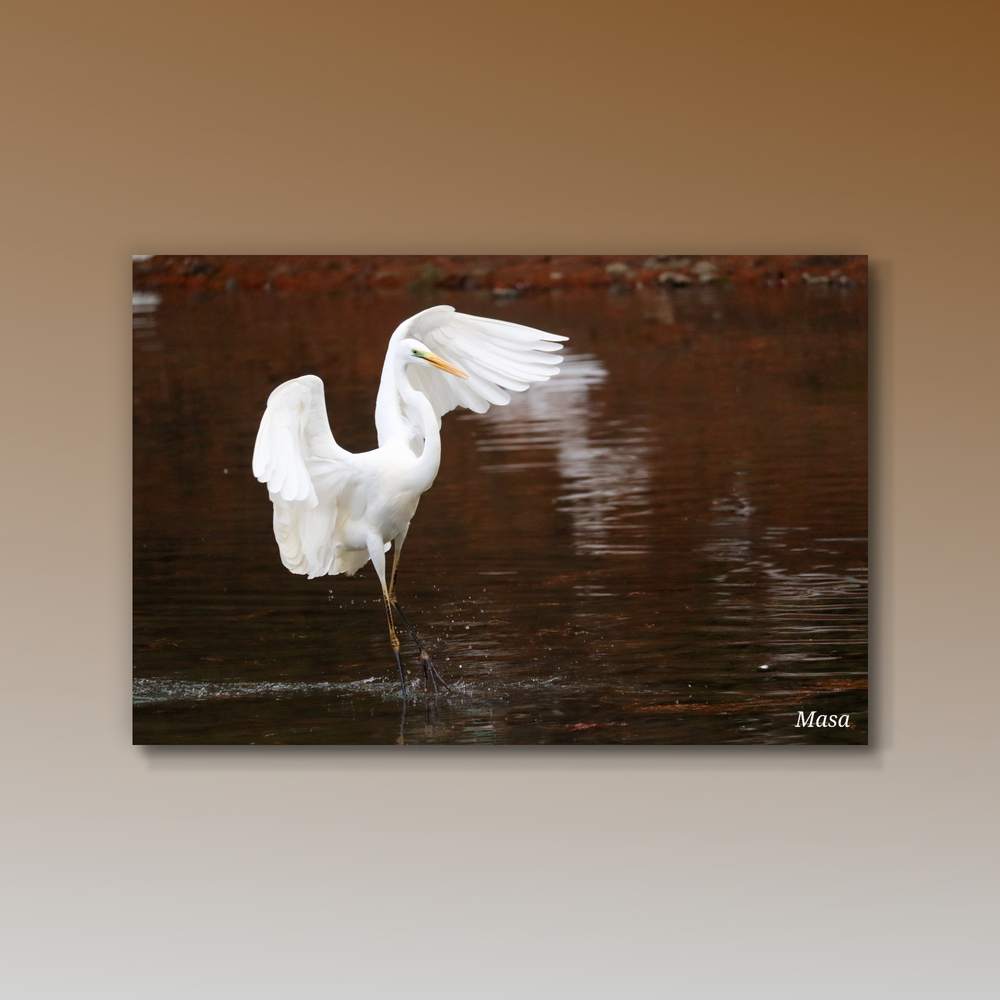 闇色の水面に浮かび上がる、 ひときわ鮮烈な白。 羽ばたくその姿は、 力強さと気品を同時に宿しています。 自然の一瞬を永遠に閉じ込めた一枚。 和の空間にも、モダンなインテリアにも調和します。
