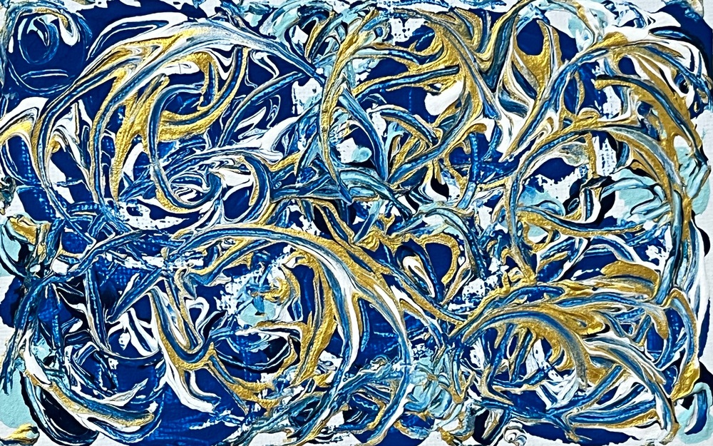 深いインディゴと金色の華やかな波が織りなす独自の世界観が、見る者を惹きつける魅力的な作品です。この美しい色のコントラストは、まるで宇宙の流れを感じさせるかのように、心に深い感動を呼び起こし、無限の可能性を表現しています。混沌の中から浮かび上がる調和のリズムが、内なる探求の旅を促し、心の奥深くに響き渡ります。