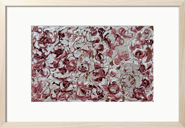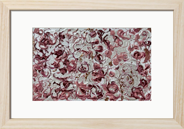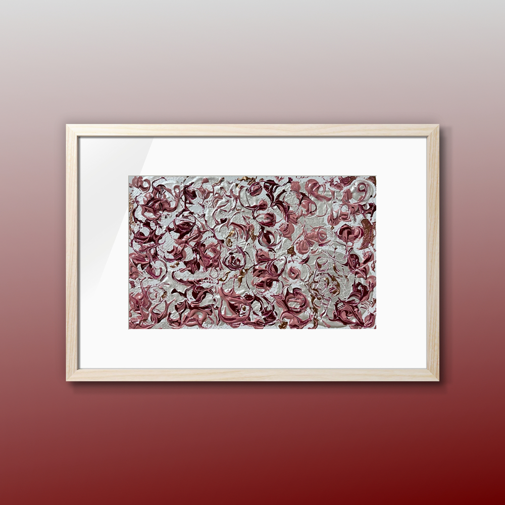 パールホワイトに重なる薔薇色の渦が、深いアメジストの陰影とブロンズの細い光を纏いながら優しく漂います。厚塗りのうねりが花弁の記憶のように重なり合い、静かな画面の中でゆっくりと溶け合う様子は、薄暮の庭に残る甘い余韻を思わせます。このキャンバスは、心の奥にそっと忍び寄る、儚くも温かな懐かしさを永遠に留めています。