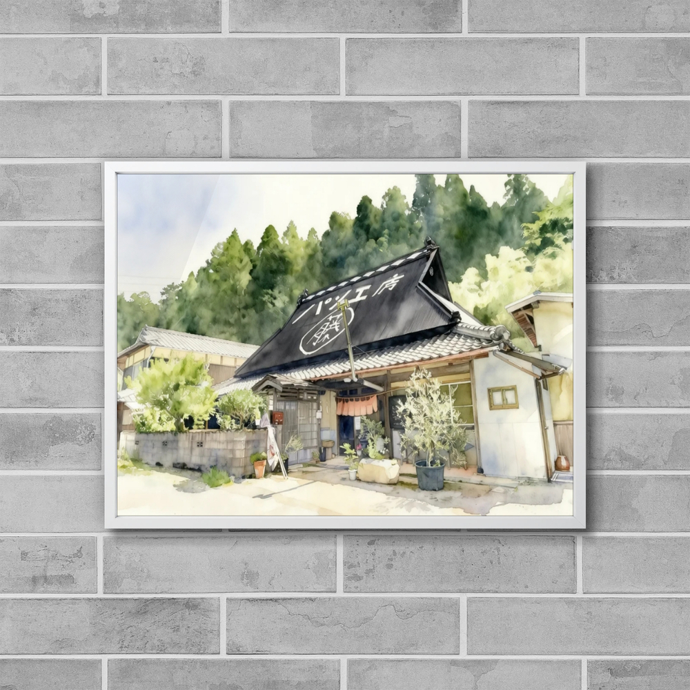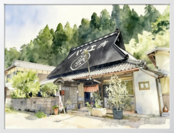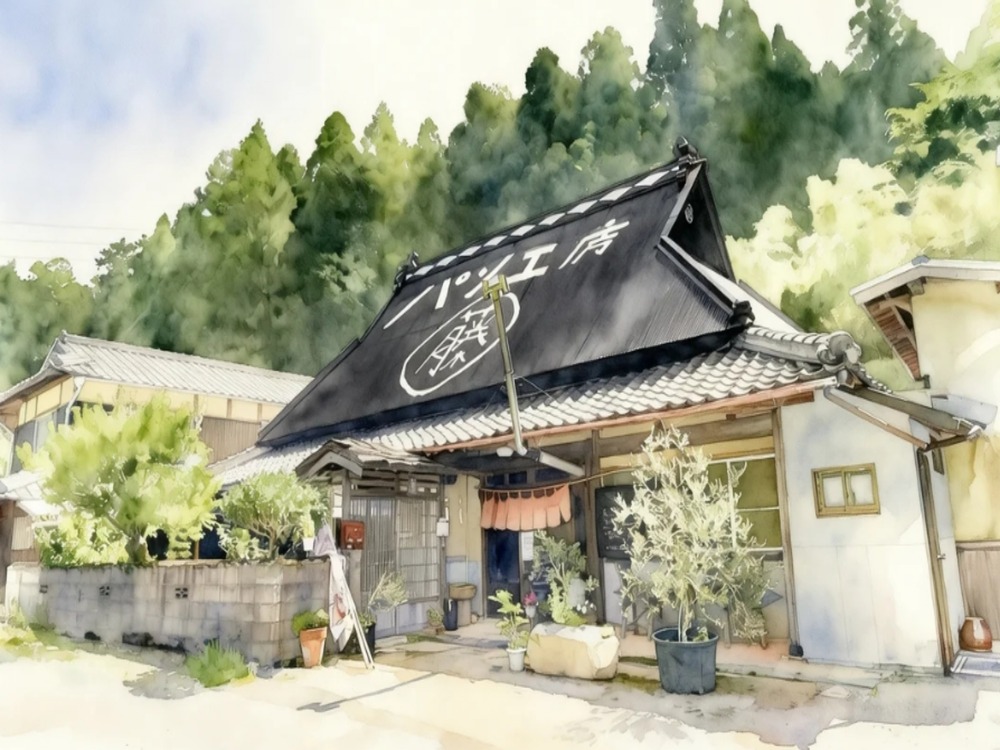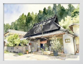 都会の喧騒を離れ、自然豊かな村の入り口で見つけた隠れ家のようなパン工房・藤。 歴史を感じさせる建物と、軒先に並ぶ植物たちが、訪れる人を優しく迎え入れます。 淡い色彩で描かれたこの風景は、丁寧な暮らしや、手作りの温もりを象徴しているかのようです。