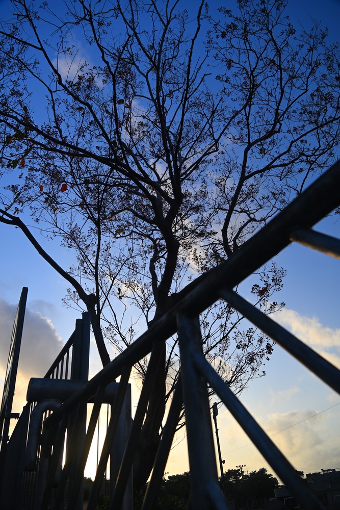 コザ運動公園陸上競技場の柵越しの夕暮れのシルエットが美でした