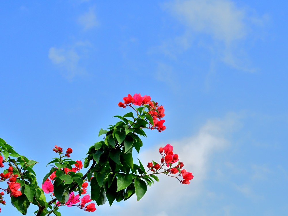 12月の奥武島の晴天に美しく咲き誇るブーゲンビレア