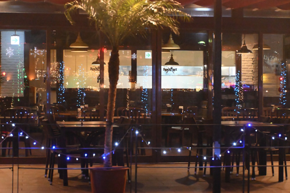 アメリカンビレジのクリスマスイルミネーションを映すレストランのガラス