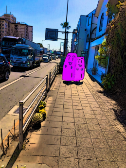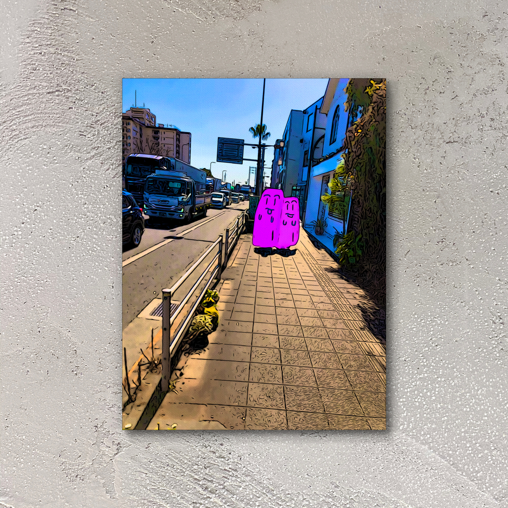 私は「脱力して気楽に今を楽しむ」をコンセプトに各地に赴いてかそこで個人的に良いなと思った人が写り込んだ風景を撮って、それをもとに観光絵画を制作しています。現実の風景の写真をデジタル加工して絵画風にしたりオリジナルのキャラクターを入れ込むことで、風景の日常の魅力の中に未知性の余白を持たせて、行ってみたい見てみたいと思う気持ちに繋がって欲しいと思っています。この作品はキャンバスに出力する前の原画です。