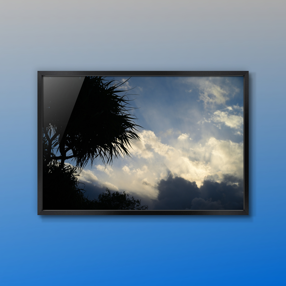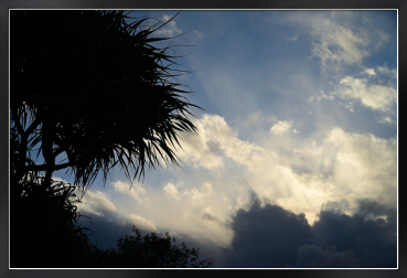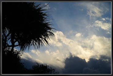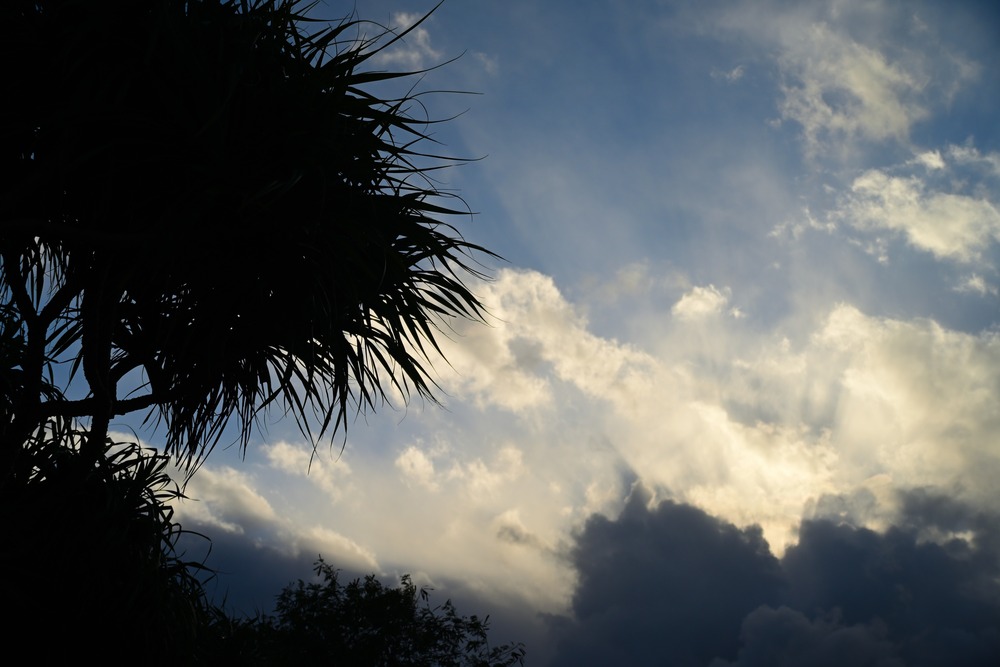 下から上方向へ噴き出す光芒の脇でアダンがシルエットになりました