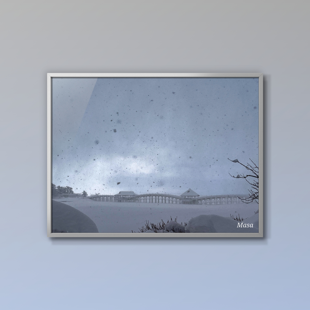 降りしきる雪が、世界の音をそっと消していく。 湖畔に佇む桟橋は、まるで時間がゆっくり流れているかのよう。 動き続ける日常の中で、ふと立ち止まるための一枚。 静けさと余白を空間にもたらす、冬の風景写真です。 届いてすぐに飾れる仕様で、リビングや寝室、ワークスペースにも自然に馴染みます。 細かな雪の粒子まで丁寧に再現した高品質プリント。 空間の印象をやわらかく整える、存在感のある一枚です