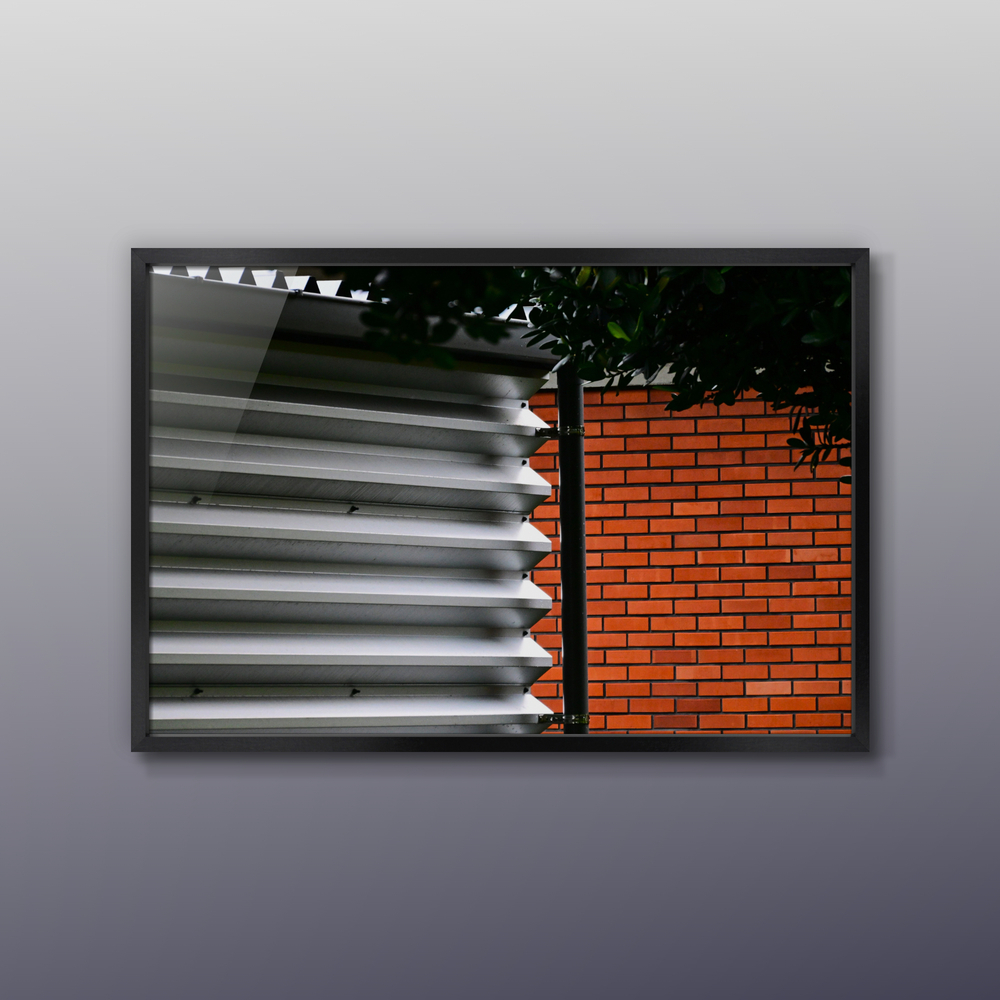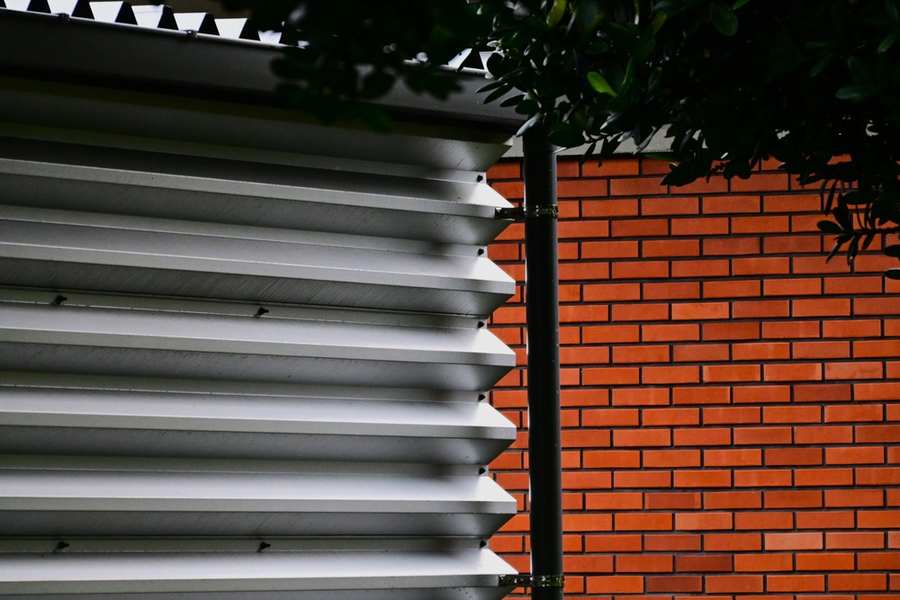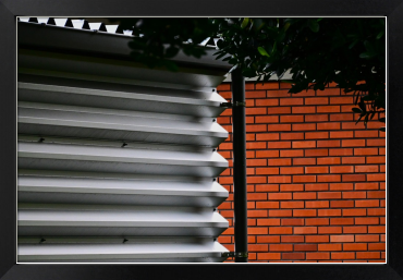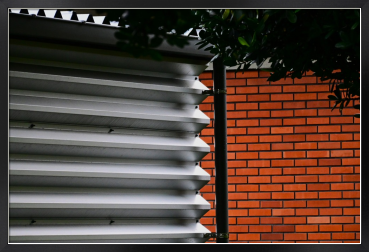 赤いレンガの壁、金属製の凹凸のある壁が色々と対比していた