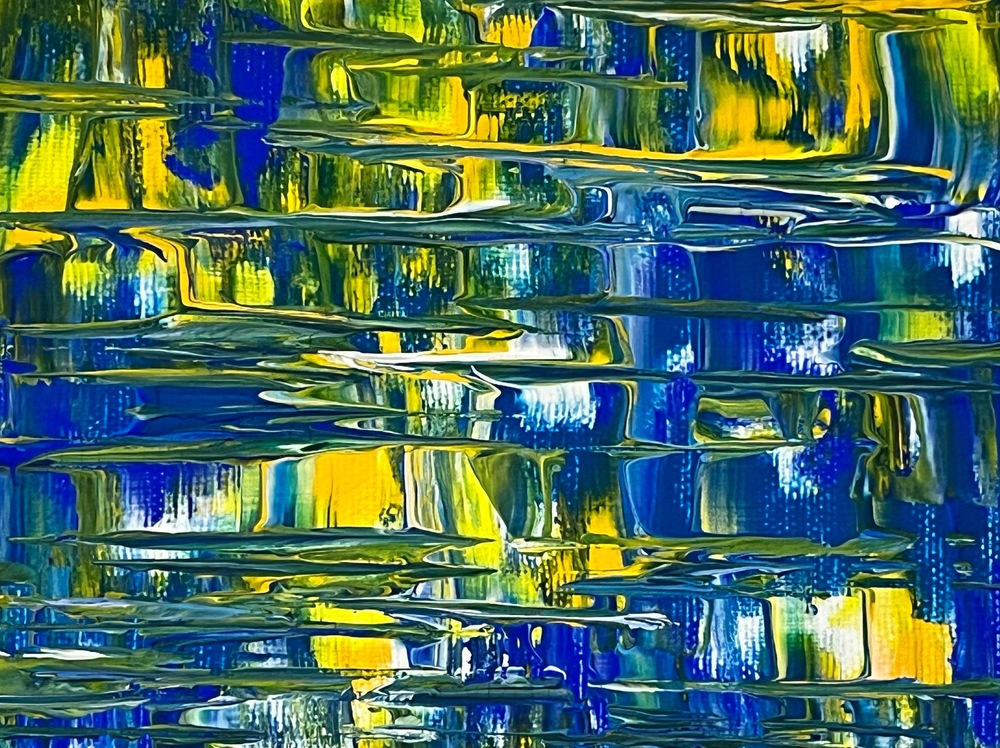 深い青色が重なり合うコバルトブルーの調和が広がり、柔らかな黄色の光が静かに差し込むアクリル抽象画です。遠くの光が水面を照らすような、穏やかで希望に満ちた情景が、心に響く美しいひとときをもたらします。日常に静かな輝きを添える一枚です。
