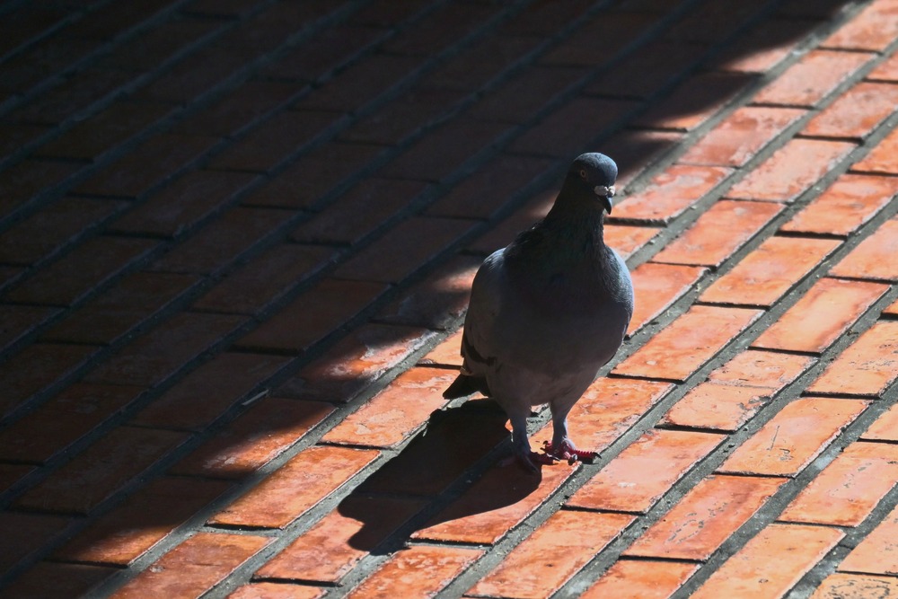 休憩所の陰から日向へ向かうハト