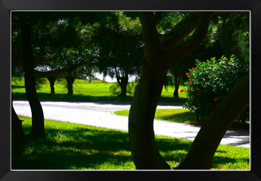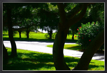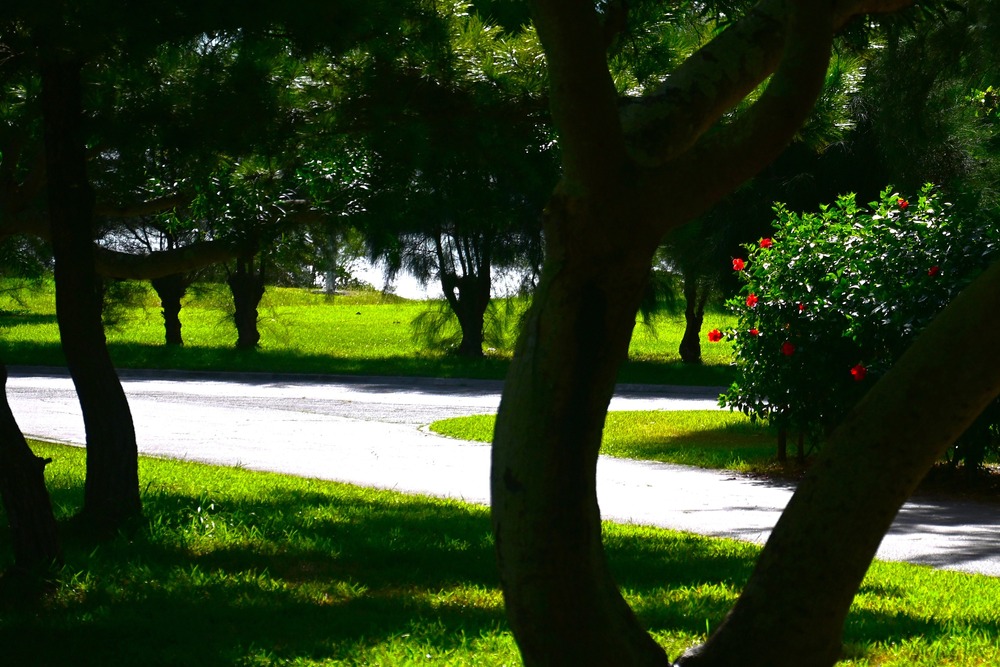アカバナの咲く夏の木陰の園路です(沖縄県総合運動公園にて)