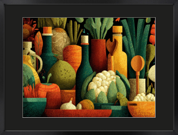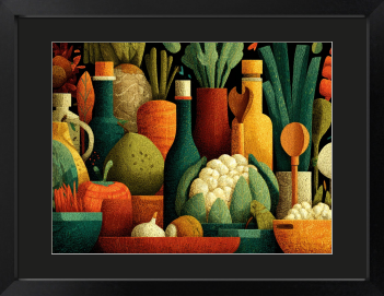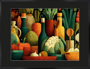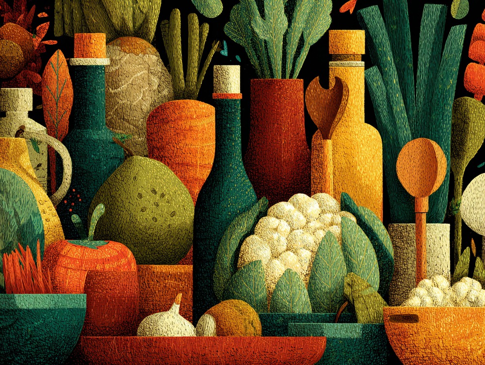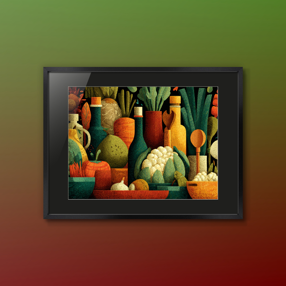 土の香る野菜と瓶のフォルムが静かに響き合う。繊細なテクスチャと深い色彩を、日々の暮らしの彩りに。