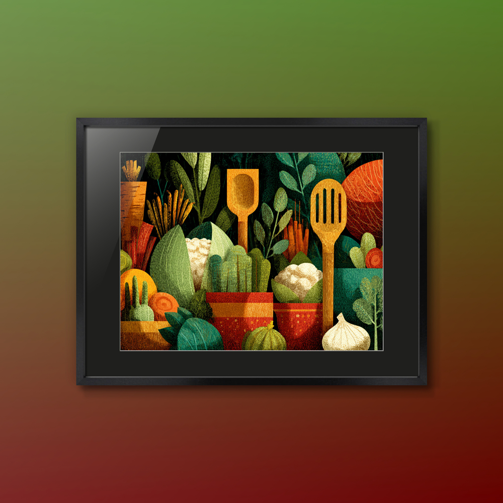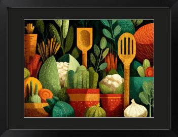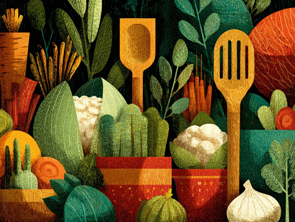 木のスプーンと瑞々しい野菜。素材が持つ力強い質感と、深い緑の重なりが暮らしに心地よい活力を与えます。
