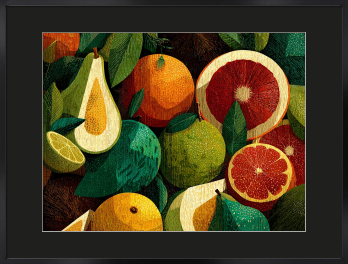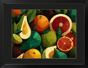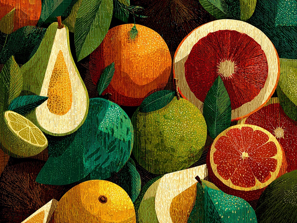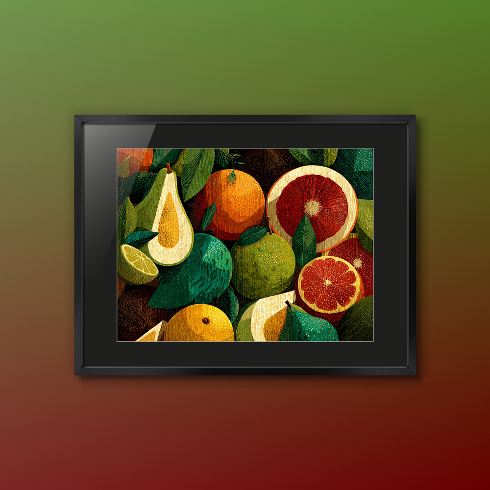 弾ける果実の色彩と、一粒ずつ描いた緻密な質感。朝の光のようなフレッシュなエネルギーを一枚に。