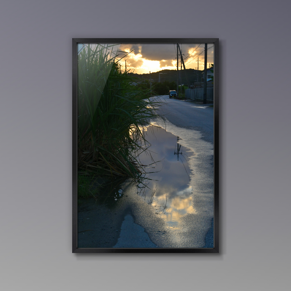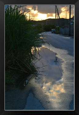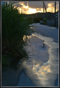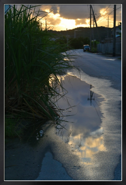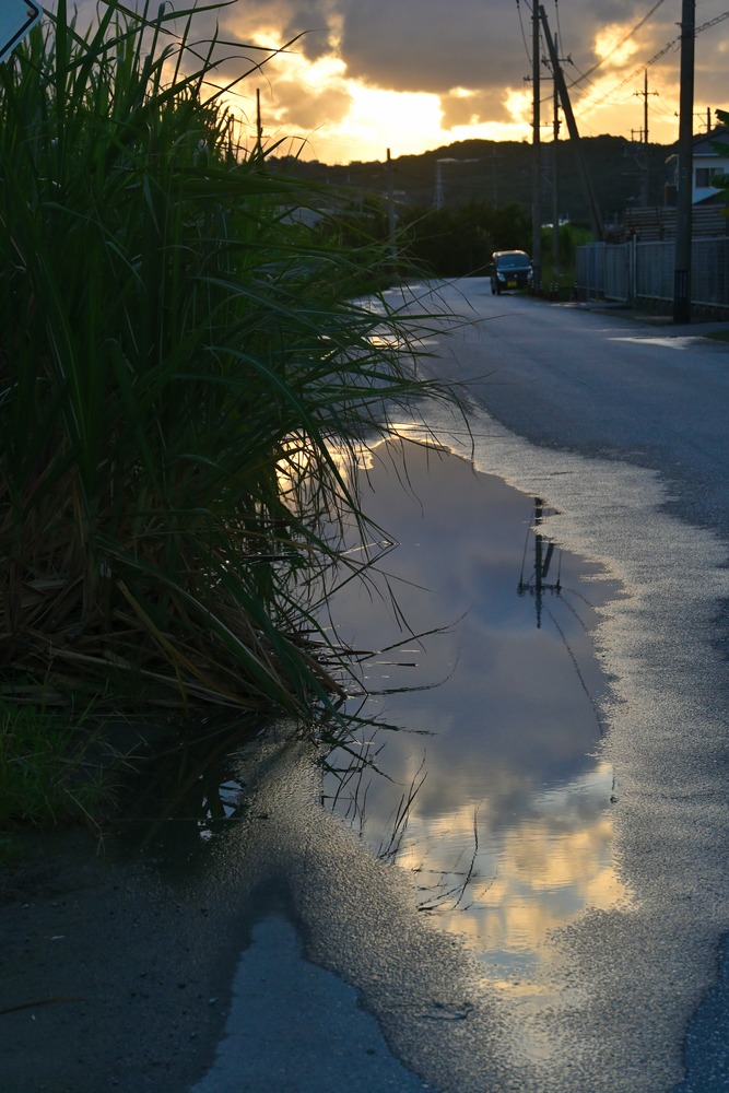 サトウキビ畑沿いの黄昏の道に水たまりがありました
